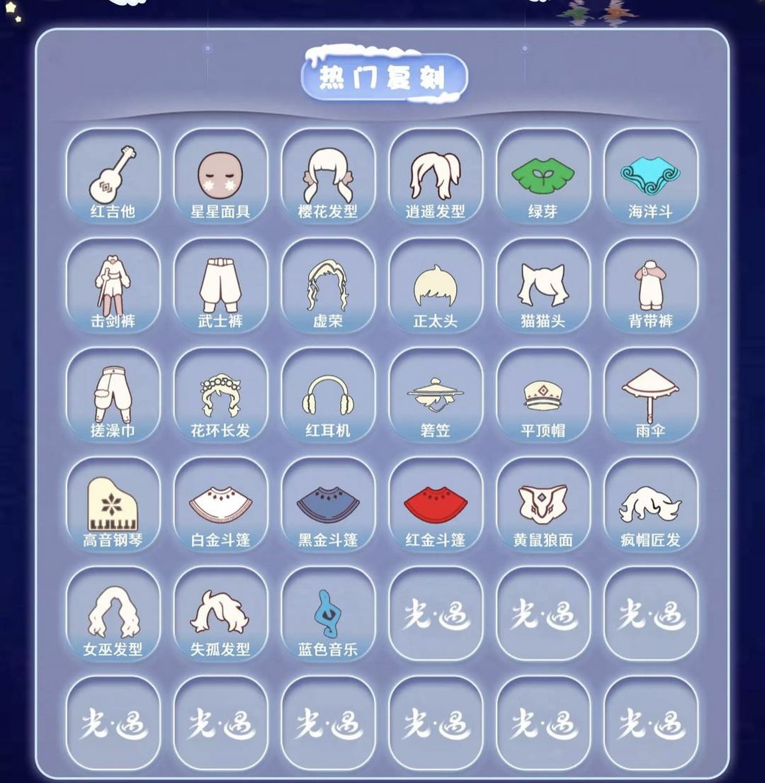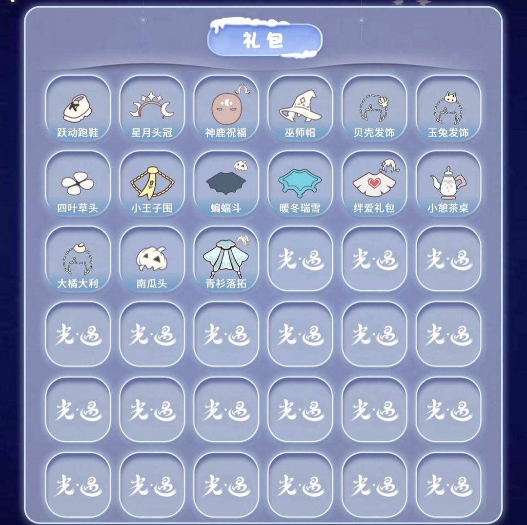 装备描述:【毕业图】晨岛 云野 雨林 霞谷 暮土 禁阁 全图毕业 【毕业季】潜海季 破晓季 欧若拉 追忆季 夜行季 拾光季 归巢季 九色鹿 筑巢季 二重奏季 姆明季 彩染季 青鸟季 双星季 迁徙季 【稀有礼包】跃动跑鞋 星月头冠 神鹿祝福礼包 巫师帽 贝壳发饰 玉兔发饰 四叶草头饰 小王子围巾 蝙蝠斗 暖冬瑞雪 绊爱礼包 小憩茶桌 大橘大利 南瓜头 青衫落拓礼包 【毕业物品】潜水面具 单边小辫 维京斗篷 黄眉面具 双翼遥鲲斗 冥龙斗篷 留辫蘑菇头 高领舞服 透明蝶翼斗 肩带 追忆之书 棕熊面具 绒毛斗篷 西部帽 粗框眼镜 季卡相机 五塑彩带斗 五塑彩羽发 九色鹿飞天斗篷 九色鹿丝带裤 九色鹿丸子头 光之子试衣 设计师长袍 白色高脚钢琴 蓝色燕尾服 合奏挂画 姆明抱枕 姆明大伞 妮妮长裙 彩染围巾斗篷 辉光羚羊面具 青鸟斗篷 青鸟面饰 蓝色星星光环 暮星斗篷 蓝色毛绒绒鞋 蓝色毛绒裤子 海牛鹿角头饰 【热门复刻】红吉他 星星面具 樱花发型 逍遥发型 绿芽 海洋斗 击剑裤 武士裤 虚荣 正太头 猫猫头 背带裤 搓澡巾 花环长发 红耳机 箬笠 平顶帽 雨伞 高音钢琴 白金斗篷 黑金斗篷 红金