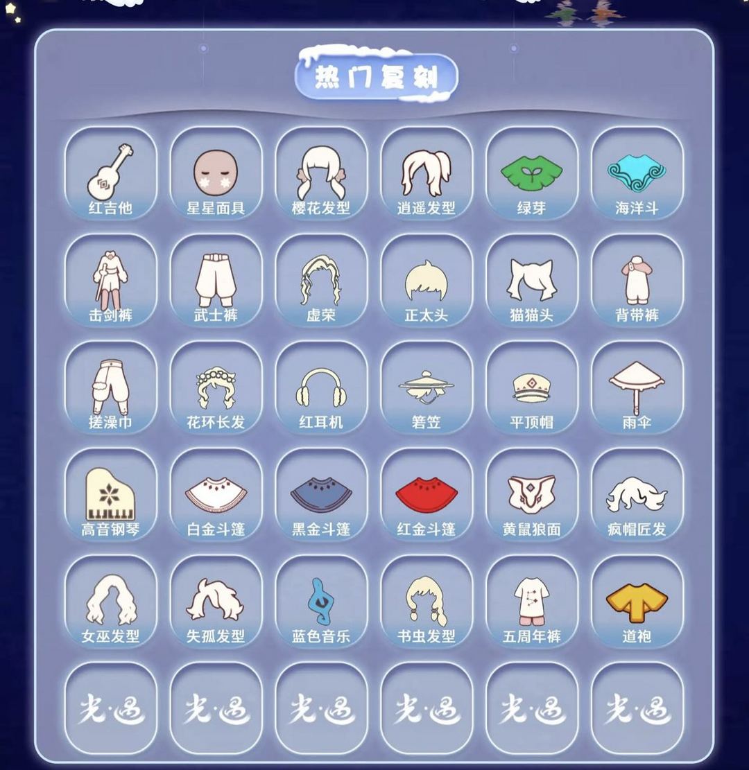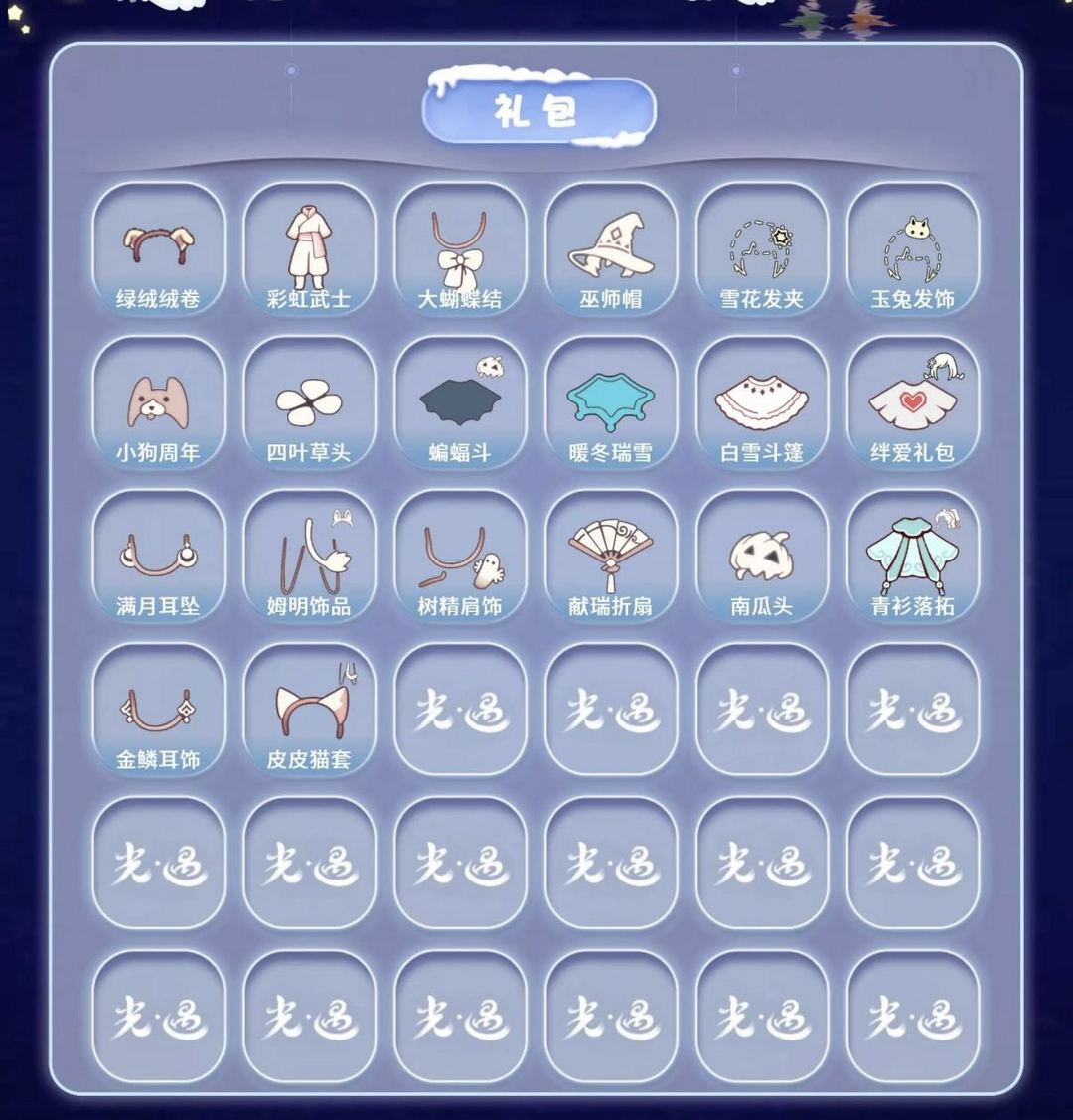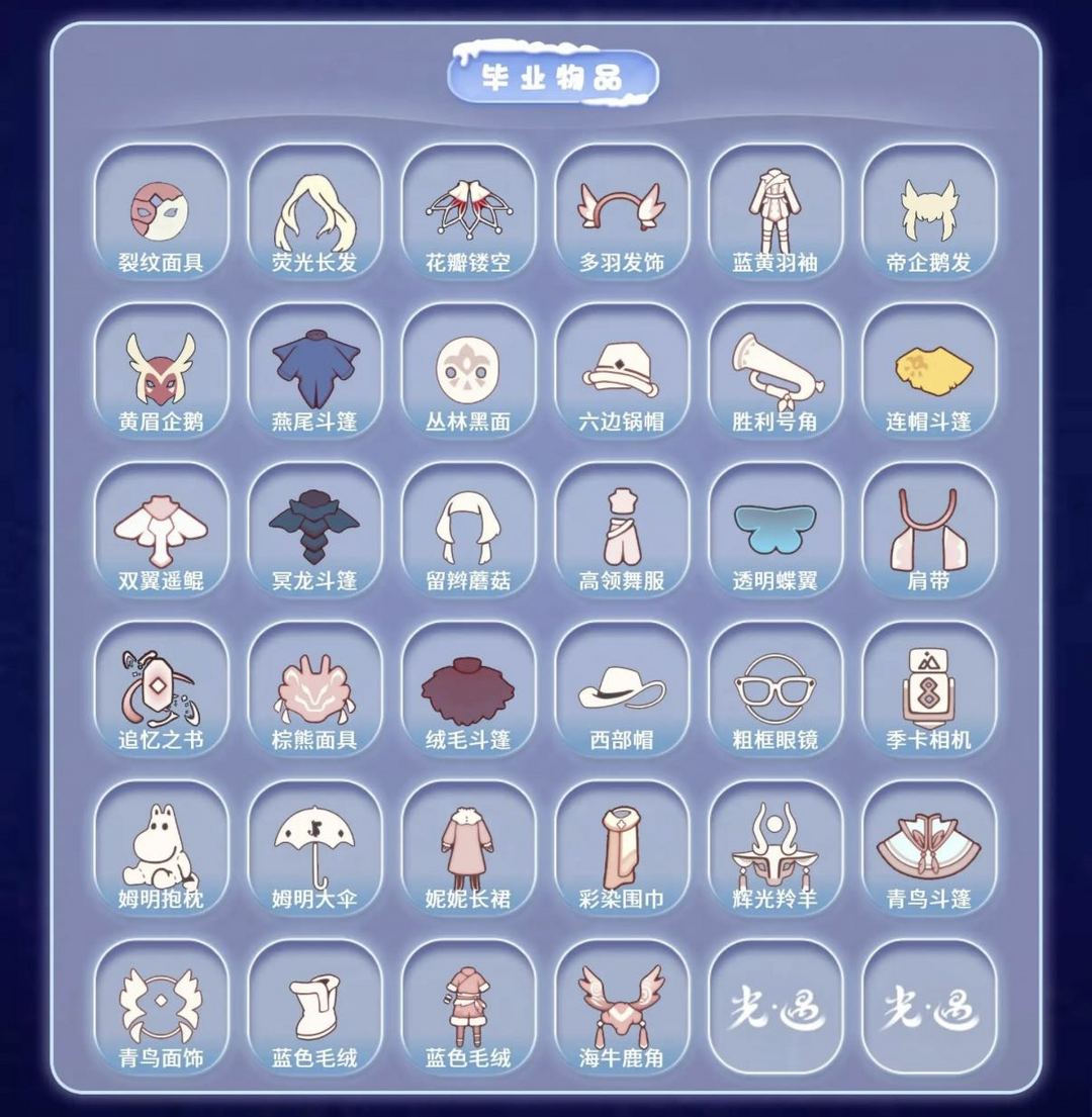 装备描述:【毕业图】晨岛 云野 雨林 霞谷 暮土 禁阁 全图毕业 【毕业季】织光季 风季 表演季 集结季 破晓季 欧若拉 追忆季 夜行季 拾光季 姆明季 彩染季 青鸟季 迁徙季 【稀有礼包】绿绒绒卷耳发饰 彩虹武士裤 大蝴蝶结 巫师帽 雪花发夹 玉兔发饰 小狗周年头饰 四叶草头饰 蝙蝠斗 暖冬瑞雪 白雪斗篷 绊爱礼包 满月耳坠 姆明饰品套装 树精肩饰礼包 献瑞折扇礼包 南瓜头 青衫落拓礼包 金鳞耳饰 皮皮猫套装 【毕业物品】裂纹面具 荧光长发 花瓣镂空斗篷 多羽发饰 蓝黄羽袖 燕尾斗篷 丛林黑面具 六边锅帽子 胜利号角 连帽斗篷 双翼遥鲲斗 冥龙斗篷 留辫蘑菇头 高领舞服 透明蝶翼斗 肩带 追忆之书 棕熊面具 绒毛斗篷 西部帽 粗框眼镜 季卡相机 姆明抱枕 姆明大伞 妮妮长裙 彩染围巾斗篷 辉光羚羊面具 青鸟斗篷 青鸟面饰 蓝色毛绒绒鞋 蓝色毛绒裤子 海牛鹿角头饰 【热门复刻】红吉他 星星面具 樱花发型 逍遥发型 绿芽 海洋斗 击剑裤 武士裤 虚荣 正太头 猫猫头 背带裤 搓澡巾 花环长发 红耳机 箬笠 平顶帽 雨伞 高音钢琴 白金斗篷 黑金斗篷 红金斗篷 黄鼠狼面具 疯帽匠发型 女巫发