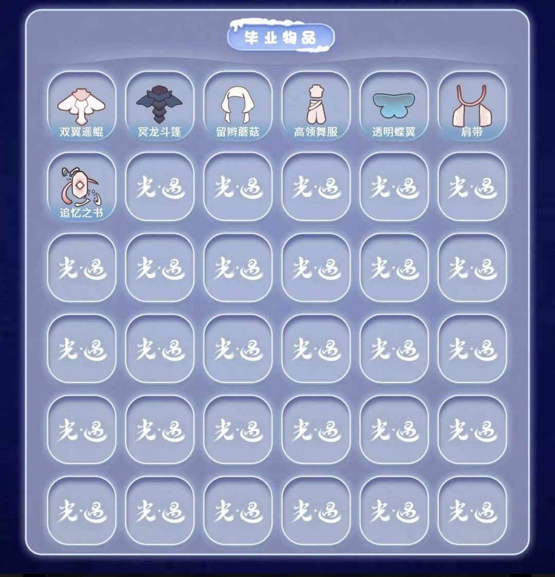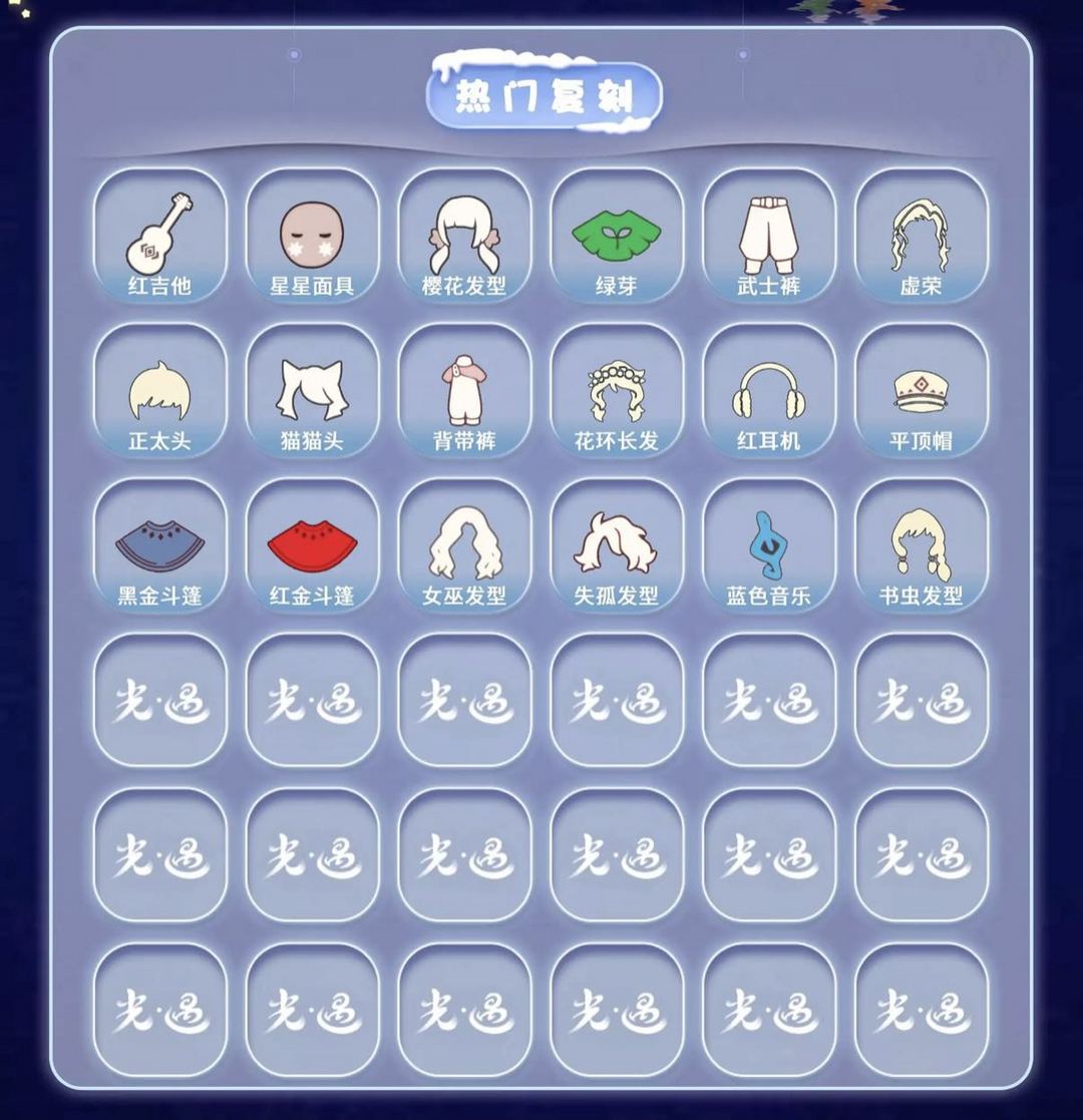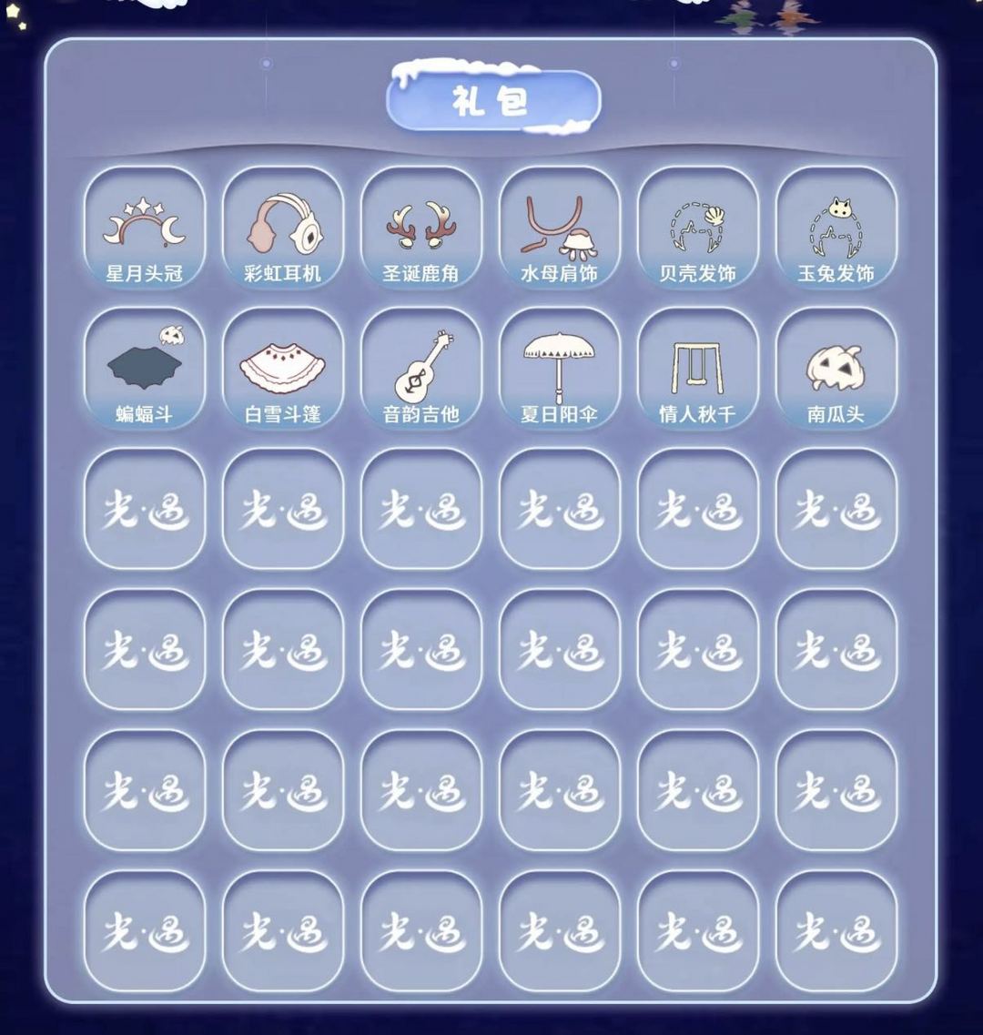 装备描述:【毕业图】雨林 霞谷 【毕业季】破晓季 欧若拉 追忆季 【稀有礼包】星月头冠 彩虹耳机 圣诞鹿角 水母肩饰 贝壳发饰 玉兔发饰 蝙蝠斗 白雪斗篷 音韵吉他 夏日阳伞 情人秋千 南瓜头 【毕业物品】双翼遥鲲斗 冥龙斗篷 留辫蘑菇头 高领舞服 透明蝶翼斗 肩带 追忆之书 【热门复刻】红吉他 星星面具 樱花发型 绿芽 武士裤 虚荣 正太头 猫猫头 背带裤 花环长发 红耳机 平顶帽 黑金斗篷 红金斗篷 女巫发型 失孤发型 书虫发型