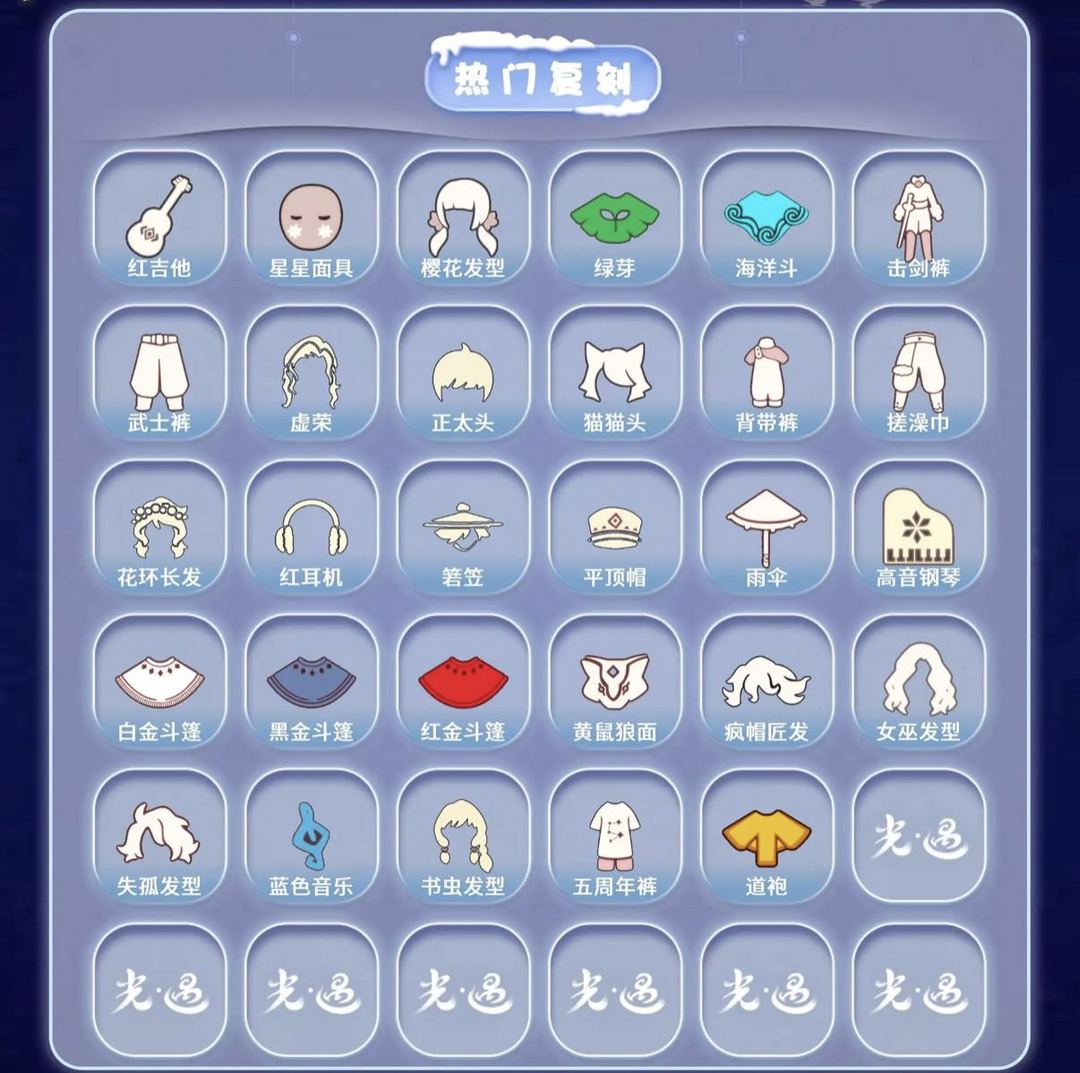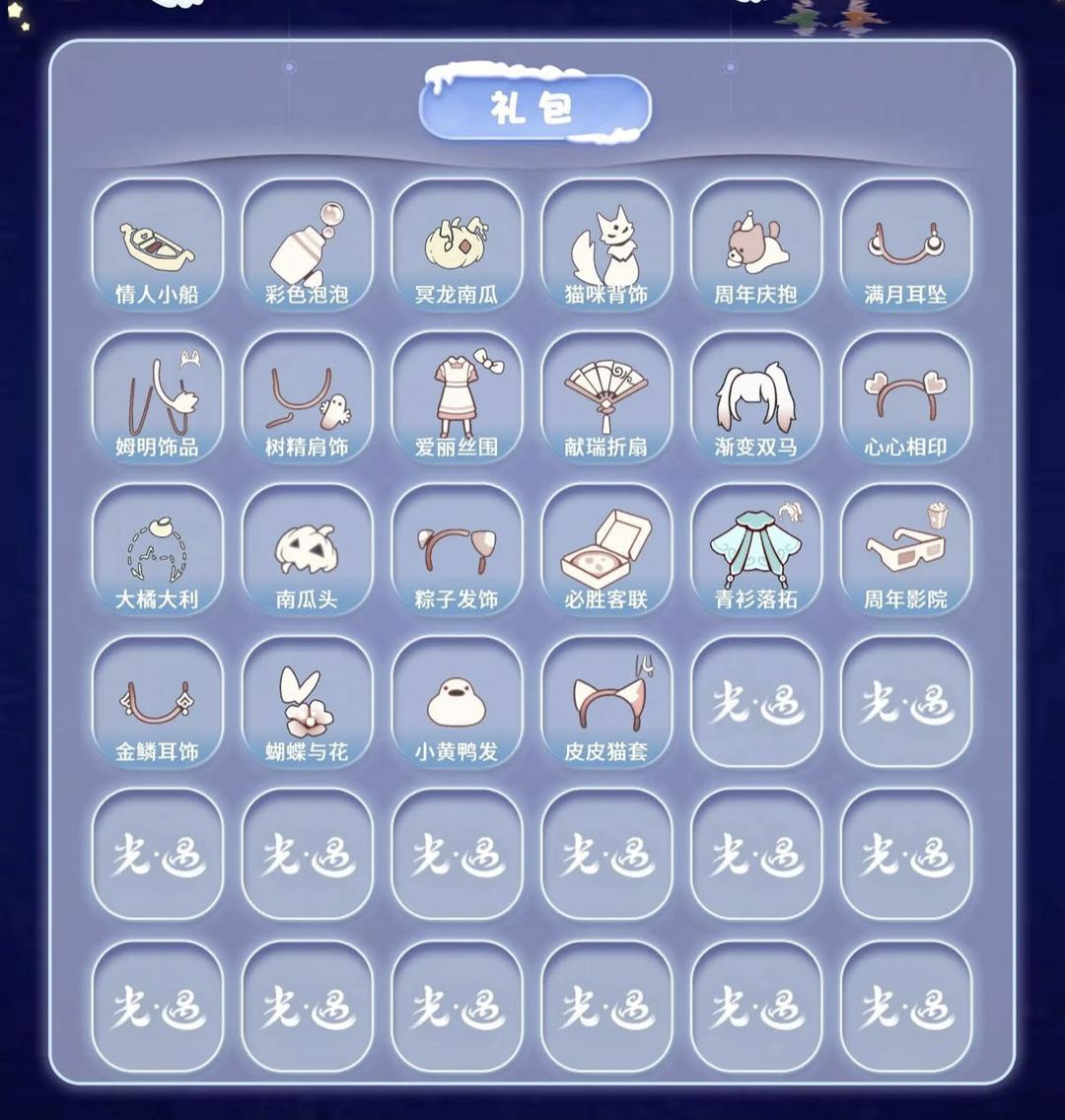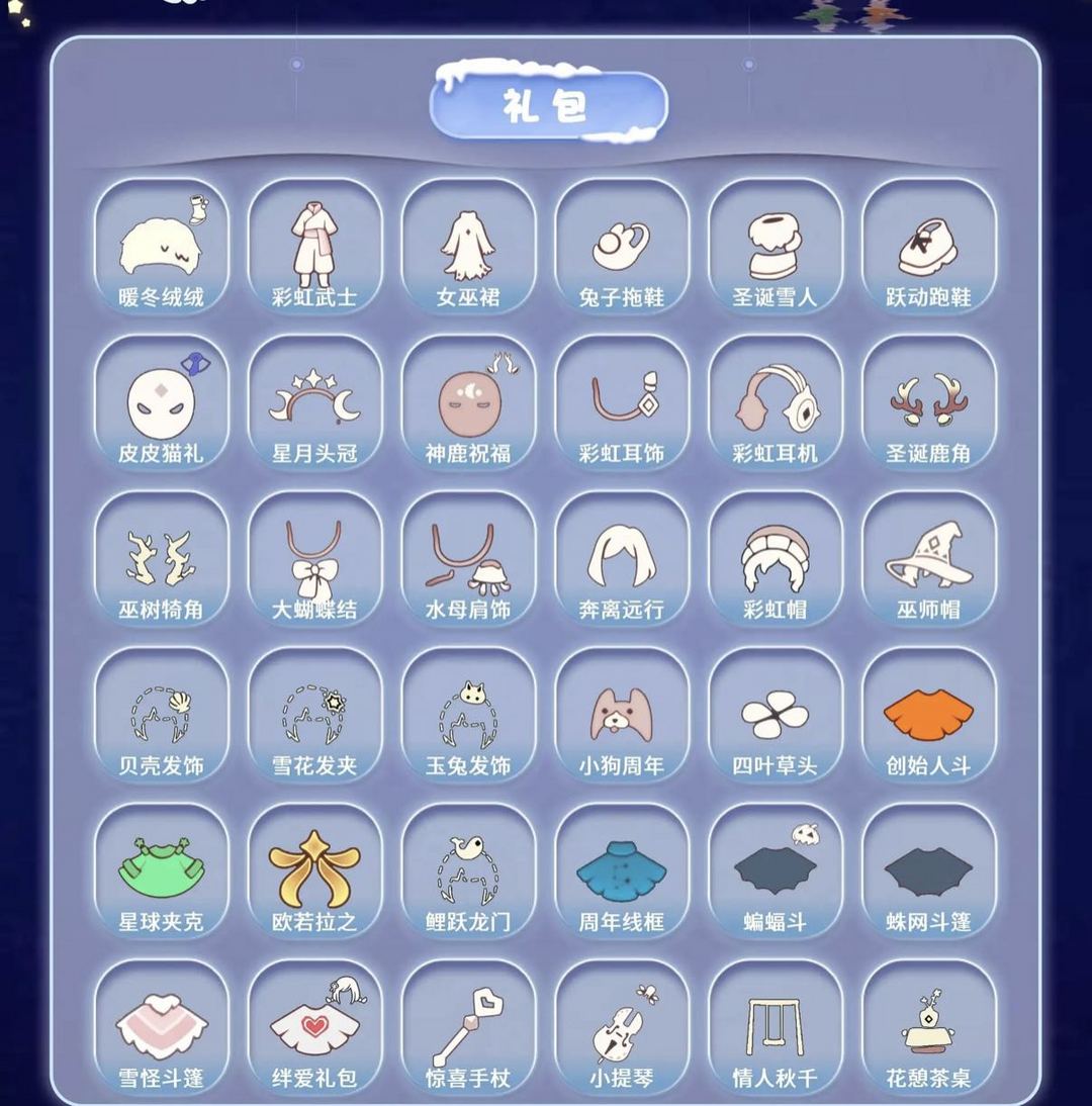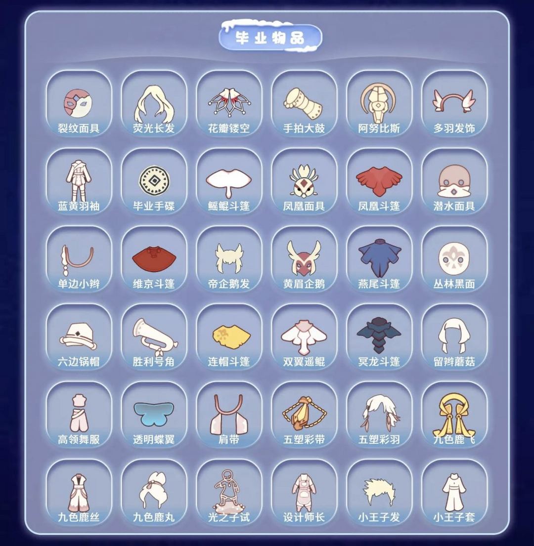 装备描述:【毕业图】晨岛 云野 雨林 霞谷 暮土 禁阁 全图毕业 【毕业季】织光季 预言季 风季 圣岛季 梦想季 潜海季 表演季 小王子季 集结季 破晓季 欧若拉 归巢季 九色鹿 筑巢季 二重奏季 姆明季 彩染季 青鸟季 双星季 迁徙季 【稀有礼包】暖冬绒绒礼包 彩虹武士裤 女巫裙 兔子拖鞋 圣诞雪人 跃动跑鞋 皮皮猫礼包 星月头冠 神鹿祝福礼包 彩虹耳饰 彩虹耳机 圣诞鹿角 巫树犄角 大蝴蝶结 水母肩饰 奔离远行发 彩虹帽 巫师帽 贝壳发饰 雪花发夹 玉兔发饰 小狗周年头饰 四叶草头饰 创始人斗篷 星球夹克 欧若拉之翼 鲤跃龙门 周年线框斗篷 蝙蝠斗 蛛网斗篷 雪怪斗篷 绊爱礼包 惊喜手杖 小提琴 情人秋千 花憩茶桌 情人小船 彩色泡泡机 冥龙南瓜 猫咪背饰 周年庆抱枕 满月耳坠 姆明饰品套装 树精肩饰礼包 爱丽丝围裙套装礼包 献瑞折扇礼包 渐变双马尾发饰礼包 心心相印发饰礼包 大橘大利 南瓜头 粽子发饰 必胜客联动披萨 青衫落拓礼包 周年影院套餐礼包 金鳞耳饰 蝴蝶与花发饰 小黄鸭发饰 皮皮猫套装 【热门复刻】红吉他 星星面具 樱花发型 绿芽 海洋斗 击剑裤 武士裤 虚荣 正太头 猫猫头