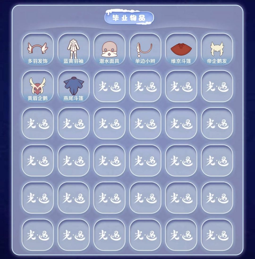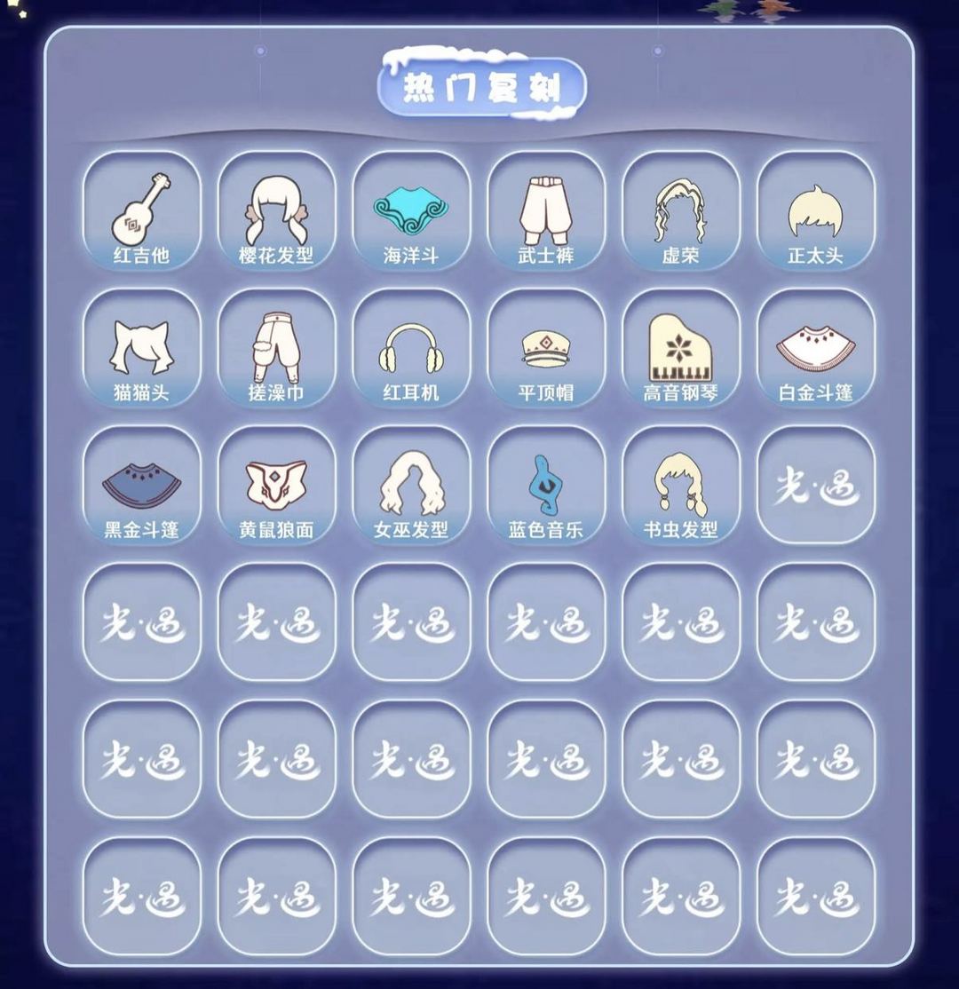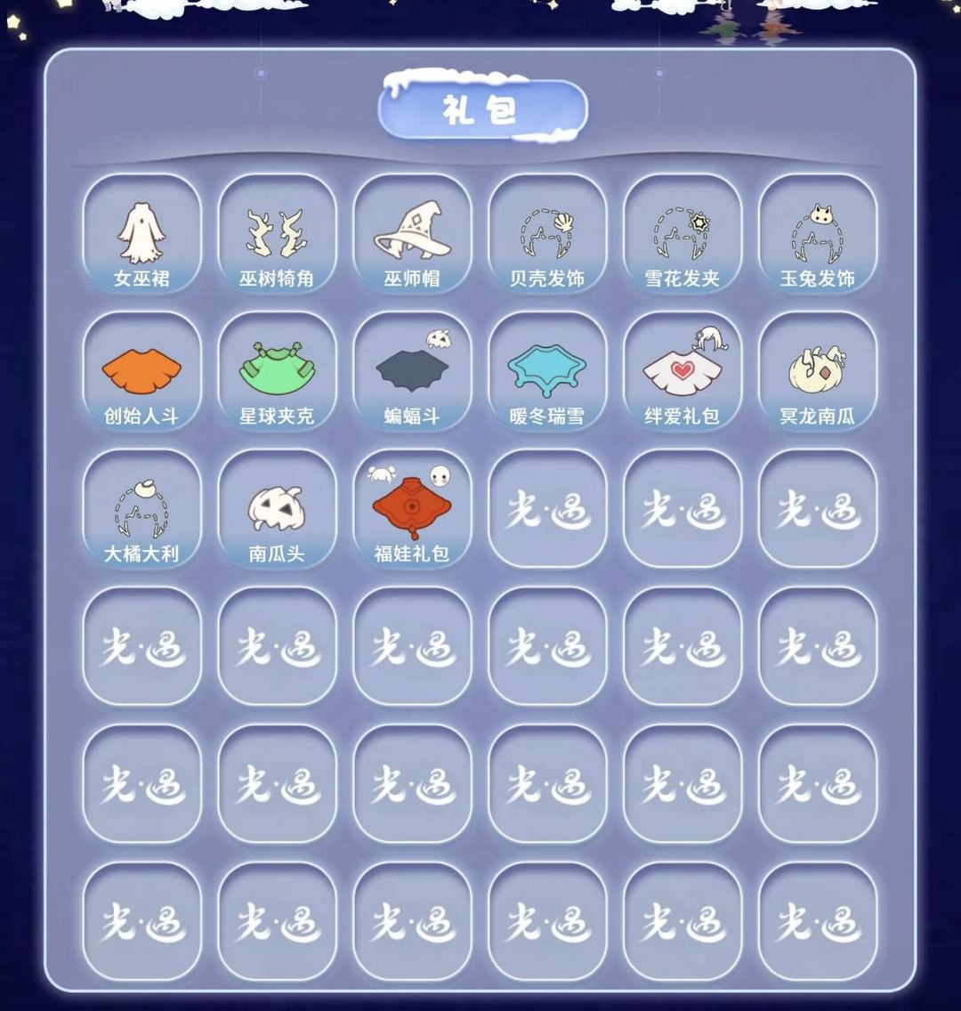 装备描述:【毕业图】雨林 霞谷 暮土 【毕业季】风季 潜海季 表演季 【稀有礼包】女巫裙 巫树犄角 巫师帽 贝壳发饰 雪花发夹 玉兔发饰 创始人斗篷 星球夹克 蝙蝠斗 暖冬瑞雪 绊爱礼包 冥龙南瓜 大橘大利 南瓜头 福娃礼包 【毕业物品】多羽发饰 蓝黄羽袖 潜水面具 单边小辫 维京斗篷 黄眉面具 燕尾斗篷 【热门复刻】红吉他 樱花发型 海洋斗 武士裤 虚荣 正太头 猫猫头 搓澡巾 红耳机 平顶帽 高音钢琴 白金斗篷 黑金斗篷 黄鼠狼面具 女巫发型 书虫发型