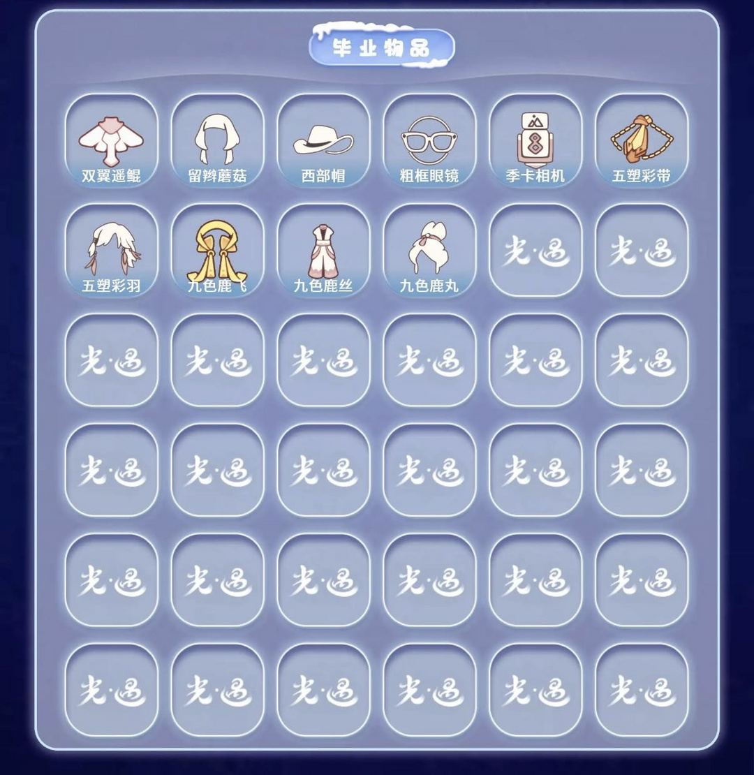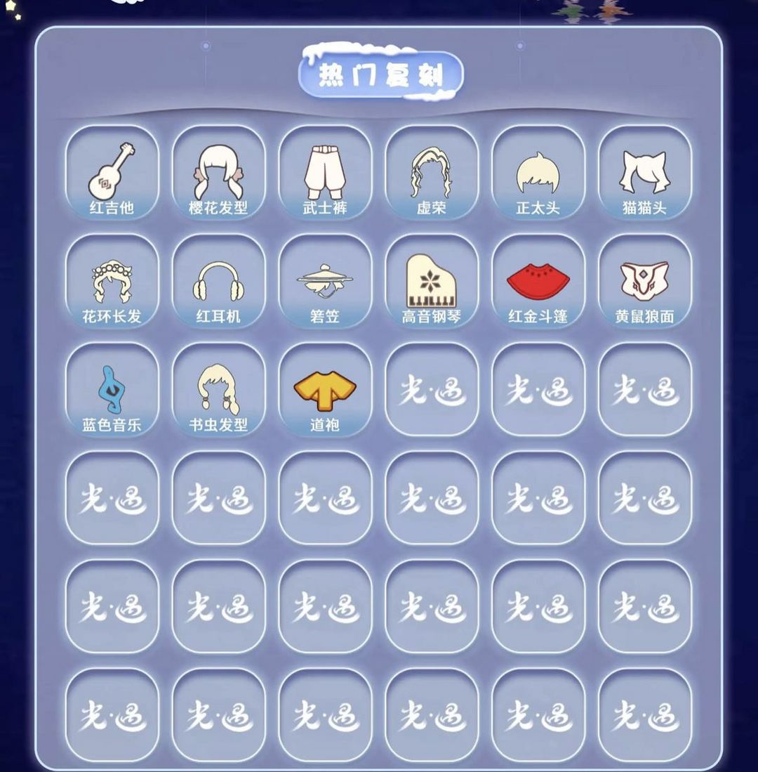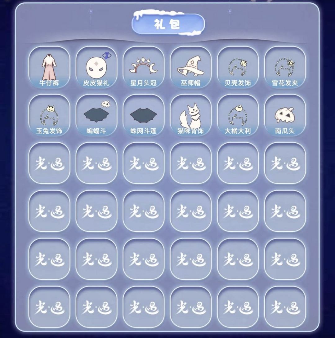 装备描述:【毕业季】拾光季 归巢季 九色鹿 【稀有礼包】牛仔裤 皮皮猫礼包 星月头冠 巫师帽 贝壳发饰 雪花发夹 玉兔发饰 蝙蝠斗 蛛网斗篷 猫咪背饰 大橘大利 南瓜头 【毕业物品】双翼遥鲲斗 留辫蘑菇头 西部帽 粗框眼镜 季卡相机 五塑彩带斗 五塑彩羽发 九色鹿飞天斗篷 九色鹿丝带裤 九色鹿丸子头 【热门复刻】红吉他 樱花发型 武士裤 虚荣 正太头 猫猫头 花环长发 红耳机 箬笠 高音钢琴 红金斗篷 黄鼠狼面具书虫发型 道袍