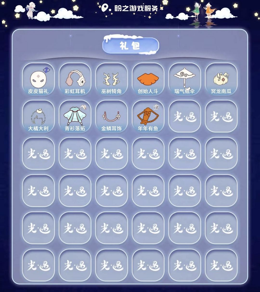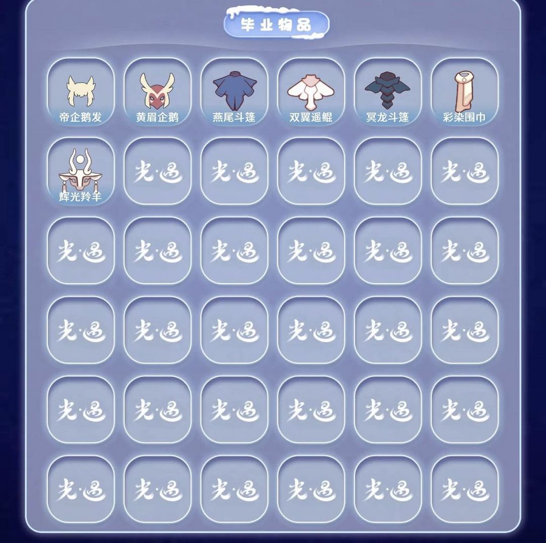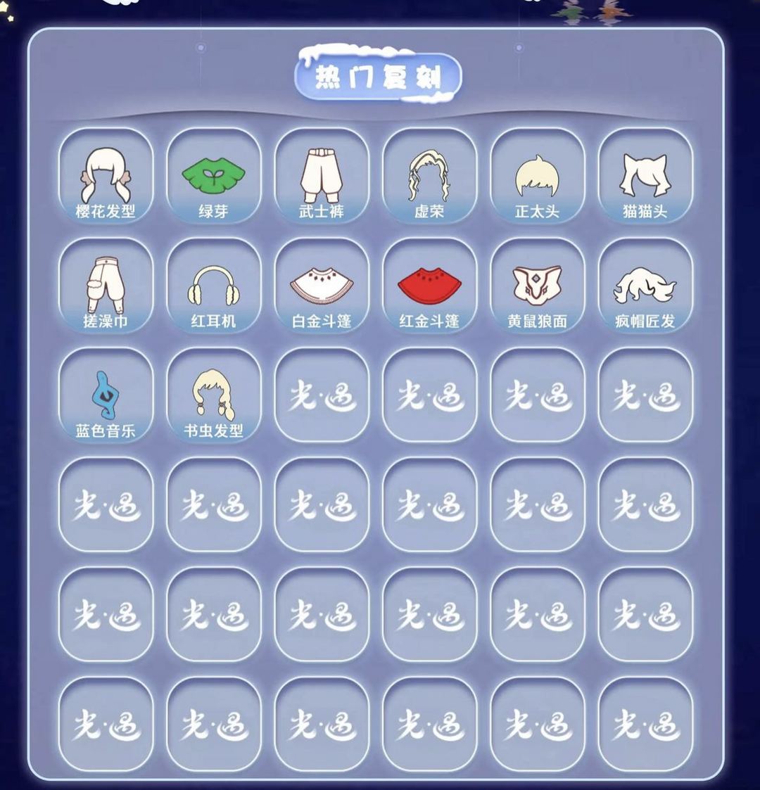 装备描述:【毕业季】表演季 破晓季 彩染季 【稀有礼包】皮皮猫礼包 彩虹耳机 巫树犄角 创始人斗篷 瑞气纸伞 冥龙南瓜 大橘大利 青衫落拓礼包 金鳞耳饰 年年有鱼礼包 【毕业物品】 黄眉面具 燕尾斗篷 双翼遥鲲斗 冥龙斗篷 彩染围巾斗篷 辉光羚羊面具 【热门复刻】樱花发型 绿芽 武士裤 虚荣 正太头 猫猫头 搓澡巾 红耳机 白金斗篷 红金斗篷 黄鼠狼面具 疯帽匠发型 书虫发型