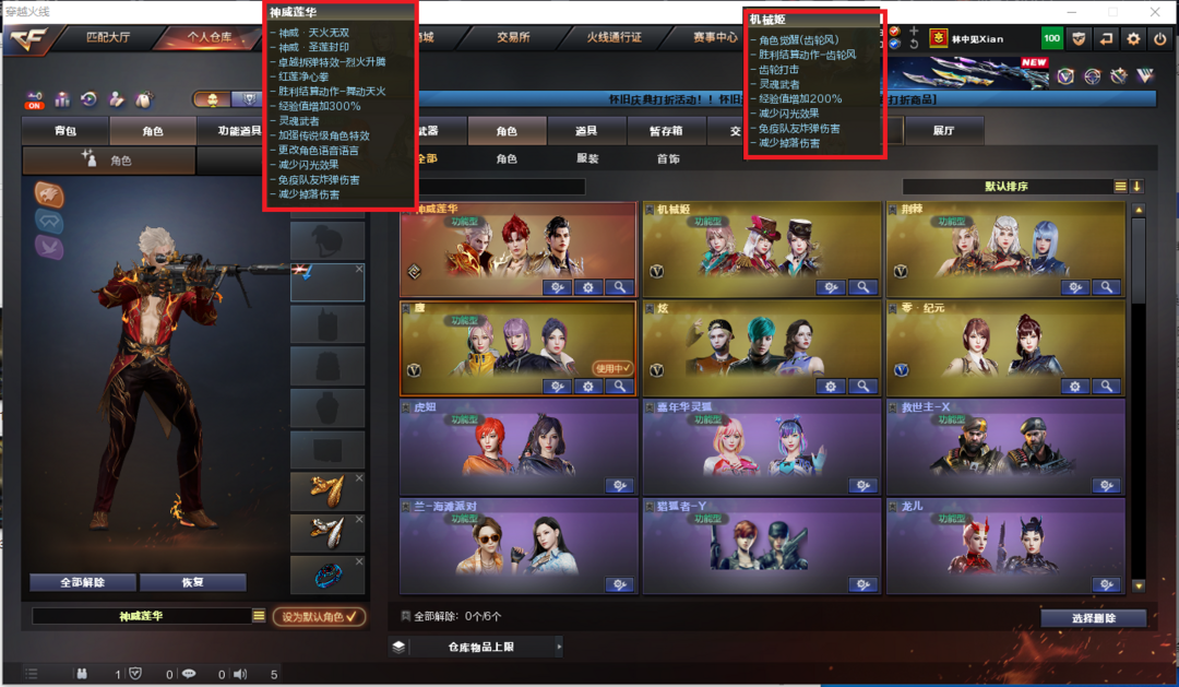 装备描述:排位:可以、、、、、、、、、、、、爆破全装:幻神、、、、2个USP冥王、USP雷暴王者、玄豹左轮、、、、FAMAS G2-天戎、白虎、白虎玄豹、王者凌虎、QBZ金色蔷薇、炽渊之怒、、白虎音效、雷神音效、、、4套玄豹、、、爆破人物(神威莲华、荆棘、机械姬、鹰)