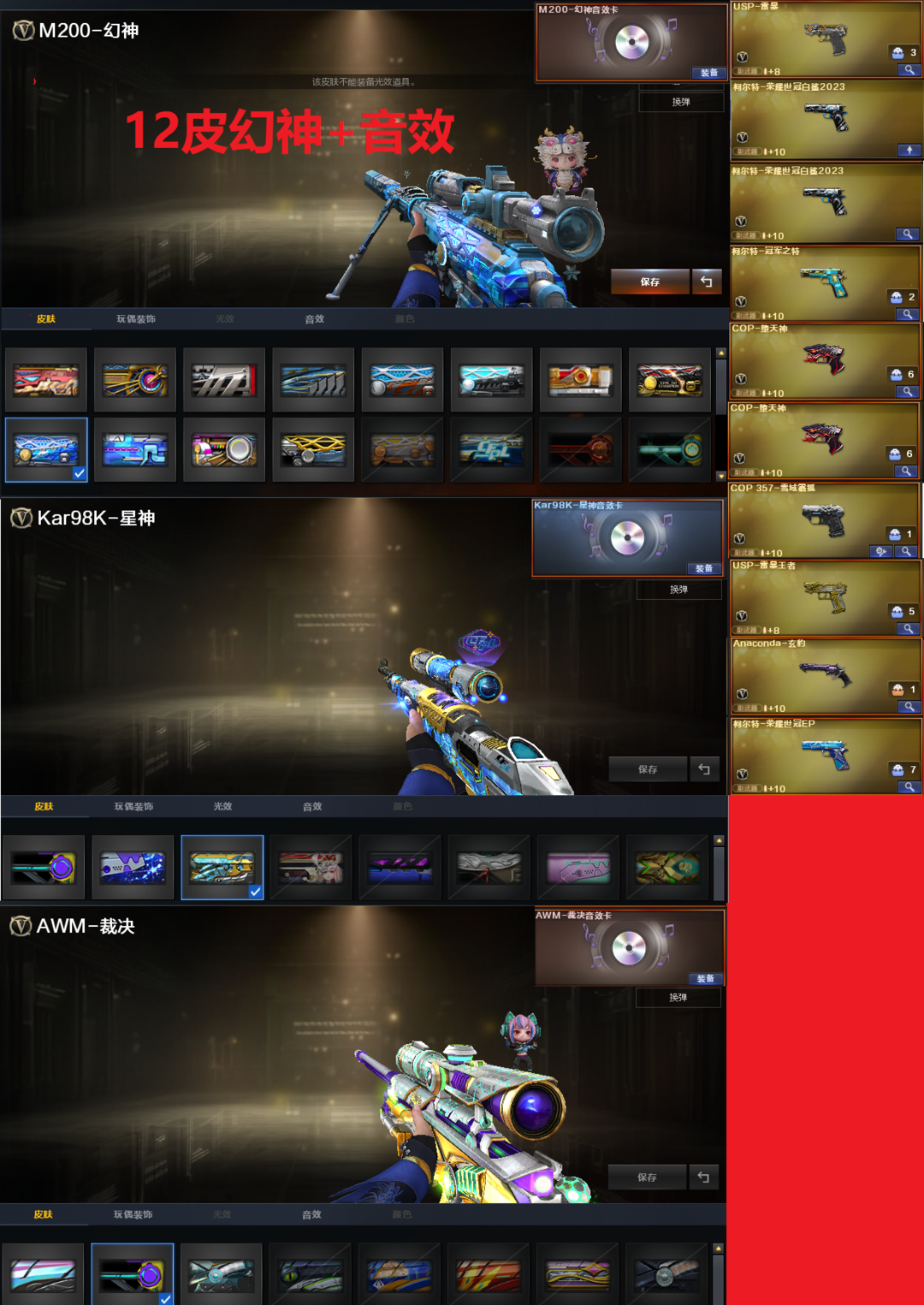 装备描述:排位:可以、、、、、、、、、、、、爆破四防:幻神12皮+音效(EP荣耀、星火小队、23白鲨、周瑜、幻神-Heartshot皮肤、2022、星耀、电流骇客、24AG冠军、AG、电竞之星、动感闪耀皮肤)、王者幻神、M200-竞技荣光、98K星神、、、、、USP雷暴、2个COP堕天神、2个23白鲨柯尔特、COP雪域霜狐、冠军之特、USP雷暴王者、EP荣耀柯尔特、、、、、、G36幻影、加利尔ACE-天袭、天戎、传说辉光、白虎、QBZ冠军之薇、2把炽芒蝶刃、、、爆破四防(传说艾莉莎、传说星骇、云悠悠、荒漠琉璃、妮妮、王者刀锋)