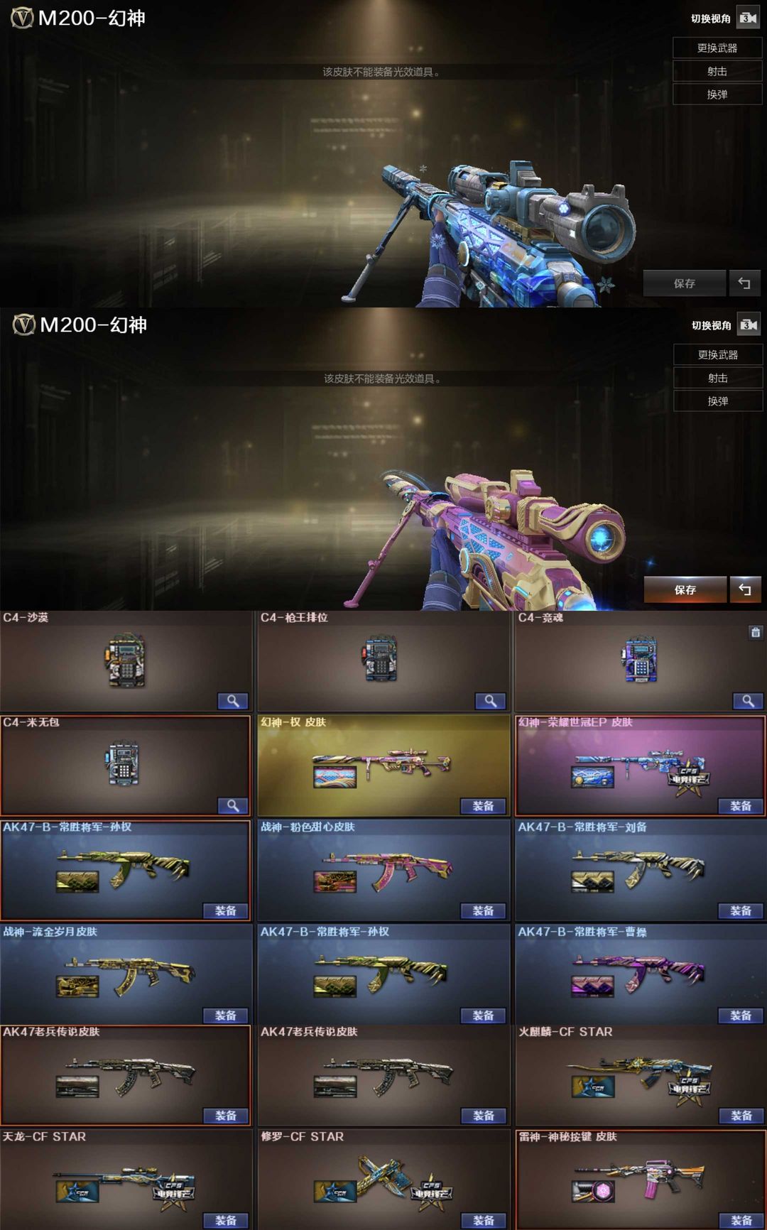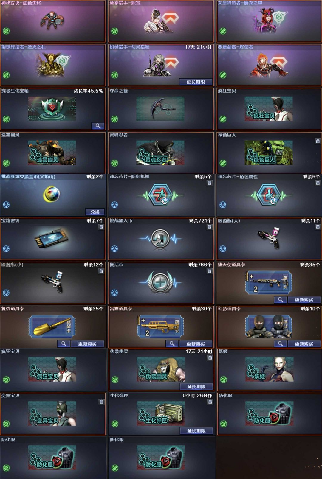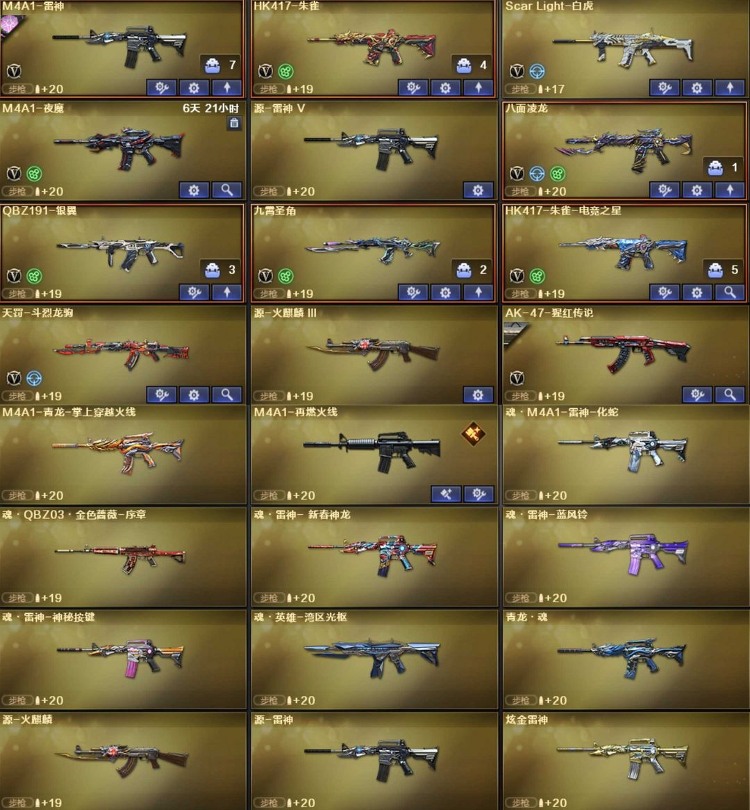 装备描述:英雄武器189个; 王者武器12个。 可以玩爆破号、生化号 狙:传说幽瞳,2把幻神(巅峰荣耀,白鲨、电流骇客,N9,冠军幻,宠儿,CF22),星神(AG冠军),极光,裁决(异化之源、流光),天龙,毁灭,金蚀,孙三炮、王者星霆,王者风神,王者之光 步枪:G36幻影、传说辉光,白虎(AG冠军,电玩,霓虹)白虎魄,青龙,青龙魄,朱雀,玄武,蔷薇(破浪逐光),云龙全套,雷神,黑骑士,死神,黑武士,天启,迷城,雷霆,烈火动感,王冰魄,王雷影,王芳薇,王势翼心鲨烈,王风势,炫金骑士黑龙。 2盘3炼狱小刚,6烈蝴蝶,炽火炎龙,A12雷霆。 副武器:传说破晓,2COP幻灵COP雷霆云龙白鲨,USP 雷暴天巧,柯尔特(荣耀世冠,冠军,无冕),王者枪刃。 近战:2蝶刃,2屠龙,4麒麟刺,2擎天,屠龙动感,龙啸奇洋,擎天竞技,斩神刀,幻灵锋。 幻灵雷套,雷霆王者雷套,2竞技雷套,8雷暴雷套,5雷霆雷套,7天巧雷套。 音效:幻神裁决极光毁灭白虎朱雀玄武蔷薇天罚雷神火麒麟。 角色:传说影煞艾丽莎,毒蝰术士,关小雨,机械师,晴雅,隼,炫,,鹰,蛇影踪,王者潘多拉,奇洋探员,便宜教练,云海玲珑,王者玲珑。
