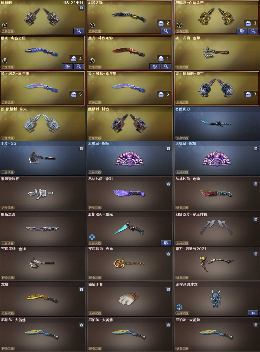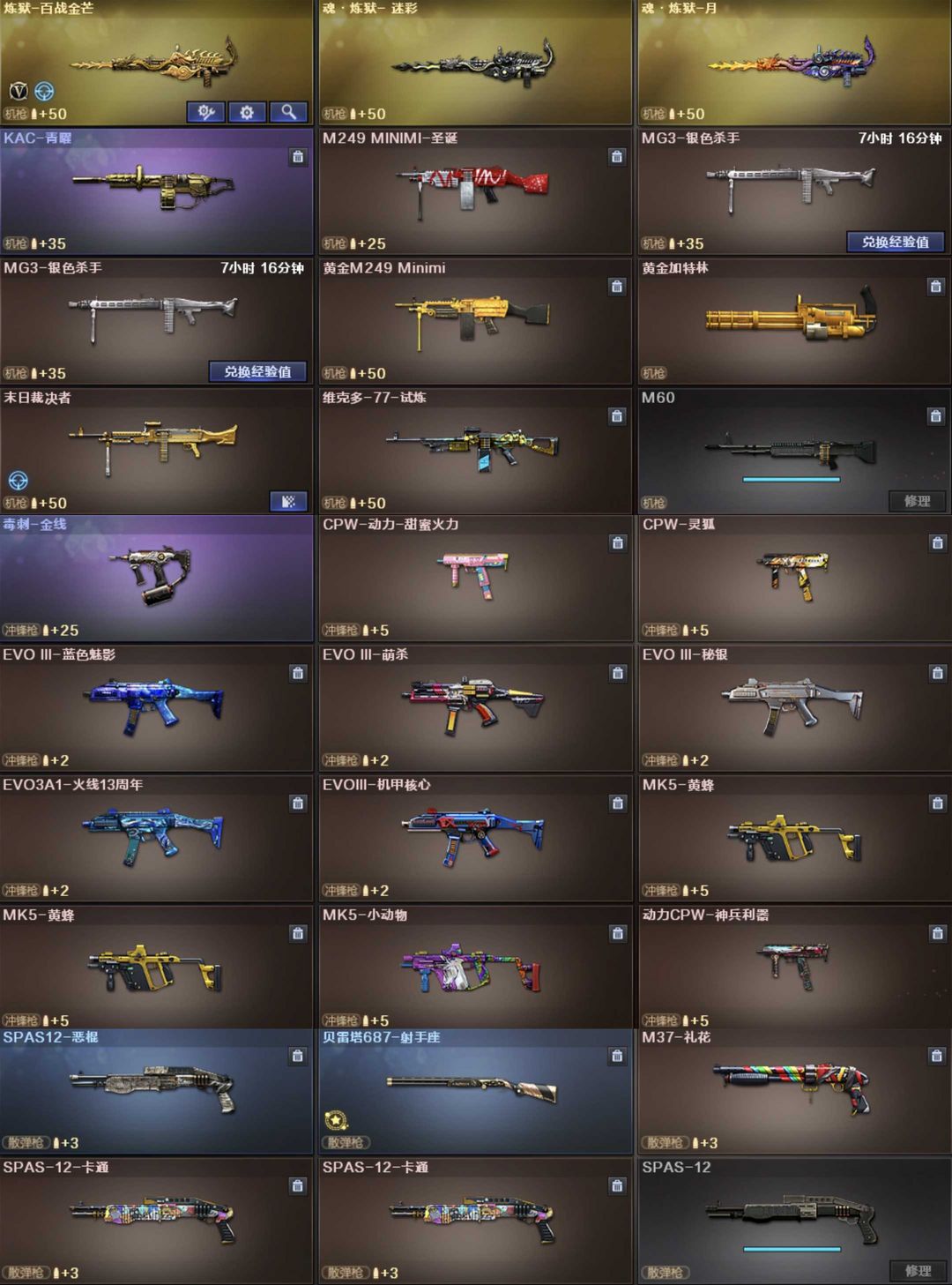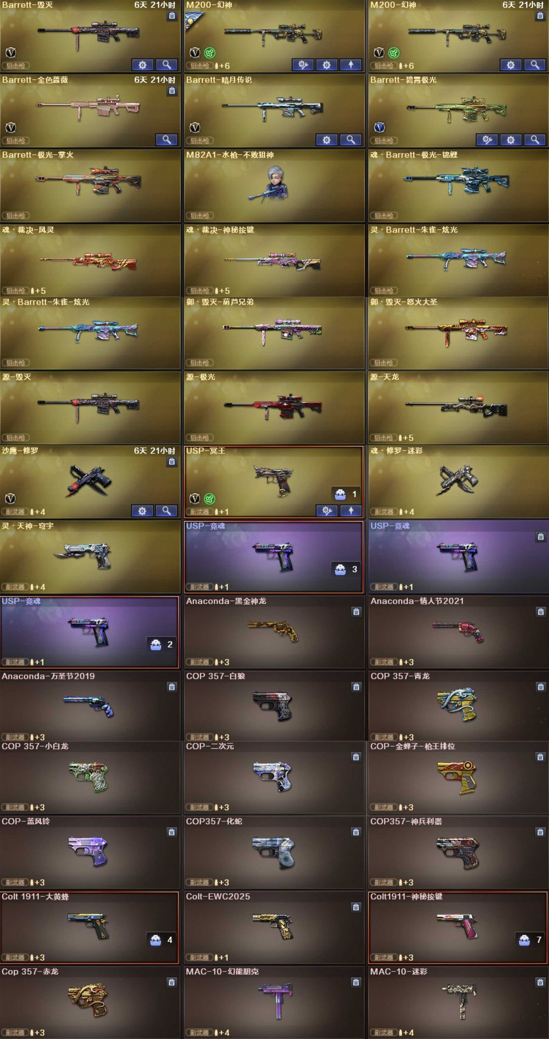 装备描述:英雄武器189个; 王者武器12个。 可以玩爆破号、生化号 狙:传说幽瞳,2把幻神(巅峰荣耀,白鲨、电流骇客,N9,冠军幻,宠儿,CF22),星神(AG冠军),极光,裁决(异化之源、流光),天龙,毁灭,金蚀,孙三炮、王者星霆,王者风神,王者之光 步枪:G36幻影、传说辉光,白虎(AG冠军,电玩,霓虹)白虎魄,青龙,青龙魄,朱雀,玄武,蔷薇(破浪逐光),云龙全套,雷神,黑骑士,死神,黑武士,天启,迷城,雷霆,烈火动感,王冰魄,王雷影,王芳薇,王势翼心鲨烈,王风势,炫金骑士黑龙。 2盘3炼狱小刚,6烈蝴蝶,炽火炎龙,A12雷霆。 副武器:传说破晓,2COP幻灵COP雷霆云龙白鲨,USP 雷暴天巧,柯尔特(荣耀世冠,冠军,无冕),王者枪刃。 近战:2蝶刃,2屠龙,4麒麟刺,2擎天,屠龙动感,龙啸奇洋,擎天竞技,斩神刀,幻灵锋。 幻灵雷套,雷霆王者雷套,2竞技雷套,8雷暴雷套,5雷霆雷套,7天巧雷套。 音效:幻神裁决极光毁灭白虎朱雀玄武蔷薇天罚雷神火麒麟。 角色:传说影煞艾丽莎,毒蝰术士,关小雨,机械师,晴雅,隼,炫,,鹰,蛇影踪,王者潘多拉,奇洋探员,便宜教练,云海玲珑,王者玲珑。