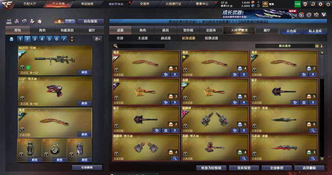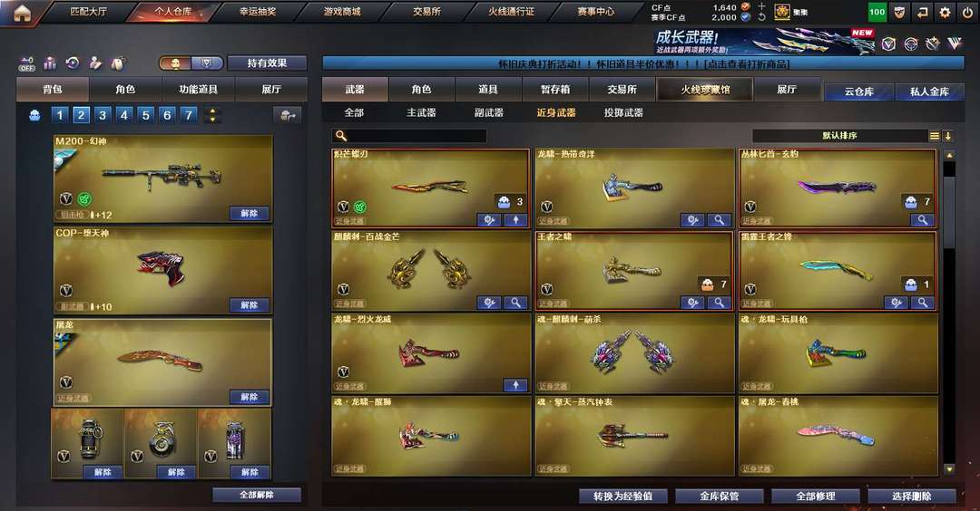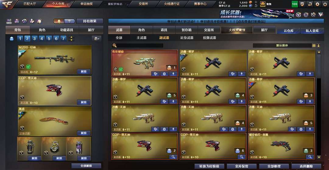 装备描述:170V 生化爆破双全装 6盘6烈斯太尔蝴蝶蛇影双骄 八面玲珑 传说破晓 蝴蝶刀 隼 毒魁 传说灵眸 幻神带皮带音效 裁决带皮带音效 王者星庭 白虎电玩蓝兔 G36幻影 法玛斯天荣 手枪全装 无冕之王 白鲨科尔特×2 荣耀世冠科尔特 cop堕天神×2 usp冥王