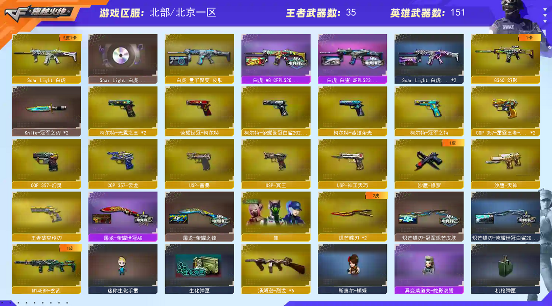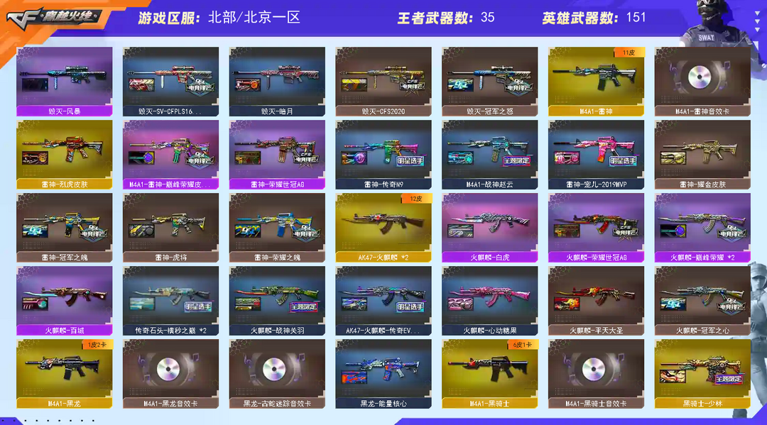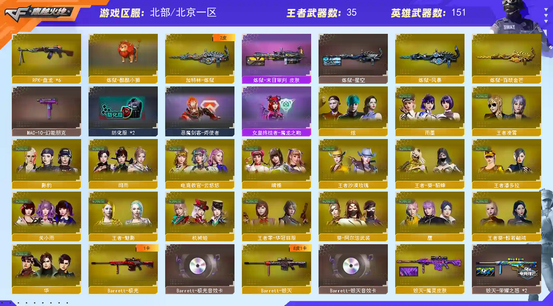 限制: 租号3次及以上 |装备描述:王者武器:AK47-雷暴王者;龙啸-王者堕天神;斩神刀-雷暴王者;王者冰锋;王者破空枪刃;王者雷影;炫金黑龙;王者星霆;青龙之魄;烟雾弹-雷霆王者-觉醒版;王者之击-觉醒版;王者之烈-觉醒版;王者之决-觉醒版;王者星神-觉醒版;王者龙血-觉醒版;COP 357-雷霆王者-觉醒版;王者森决-觉醒版;王者之魂-觉醒版;王者凤吟;王者之势-觉醒版;炫金骑士;Barrett-雷霆王者-觉醒版;M4A1-雷霆王者-觉醒版;高爆手雷-雷霆王者;闪光弹-雷霆王者-觉醒版;雷霆王者之锋-觉醒版;王者幻神-觉醒版;王者之心-觉醒版;王者白虎-觉醒版;王者之魄闪光弹 英雄武器:柯尔特-无冕之王;炽芒蝶刃;加利尔ACE-天袭;Barrett-碧霄极光;USP-冥王;高爆手雷-玄豹;烟雾弹-玄豹;闪光弹-玄豹;丛林匕首-玄豹;机械迷城-穹宇;传说圣谕;FAMAS G2-天戎;QBZ03-天罚;G36C-幻影;柯尔特-荣耀世冠白鲨2023;传说幽瞳;RPK-盘龙;超新星-热带奇洋;龙啸-热带奇洋;COP 357-云龙;QBZ03-云龙;闪光弹-云龙;烟雾弹-云龙;高爆手雷-云龙;云龙扇;黑武士-锦绣游龙;手雷-