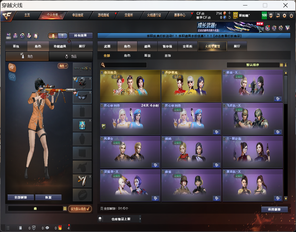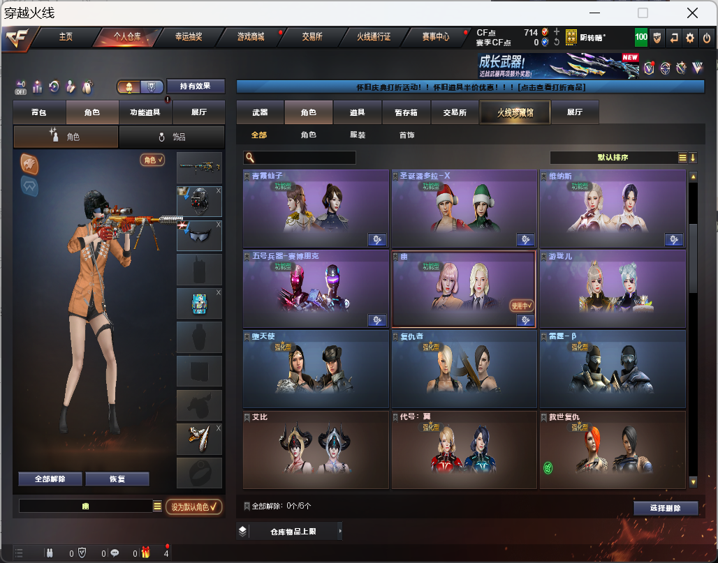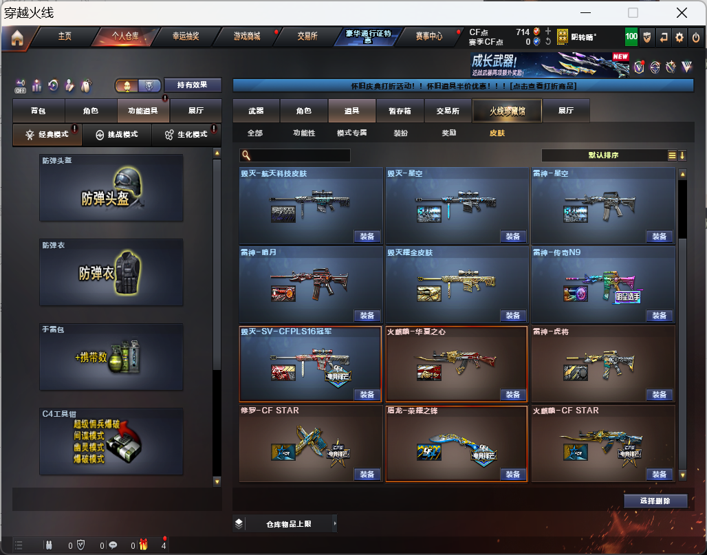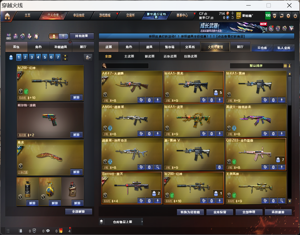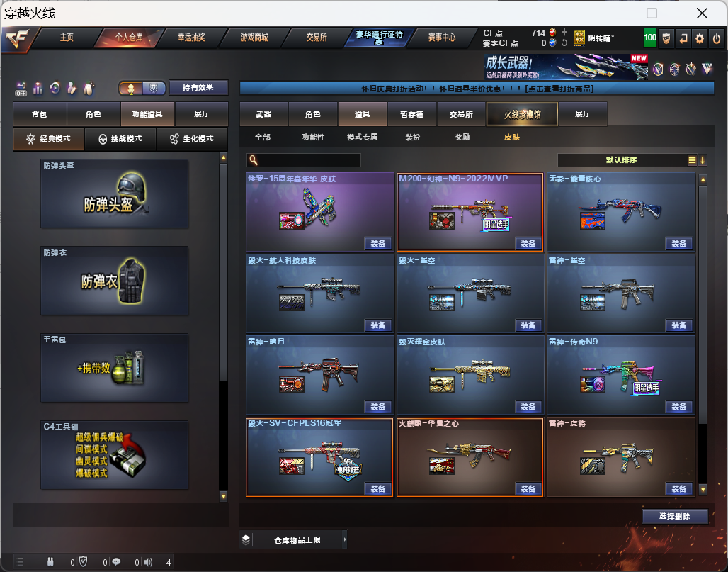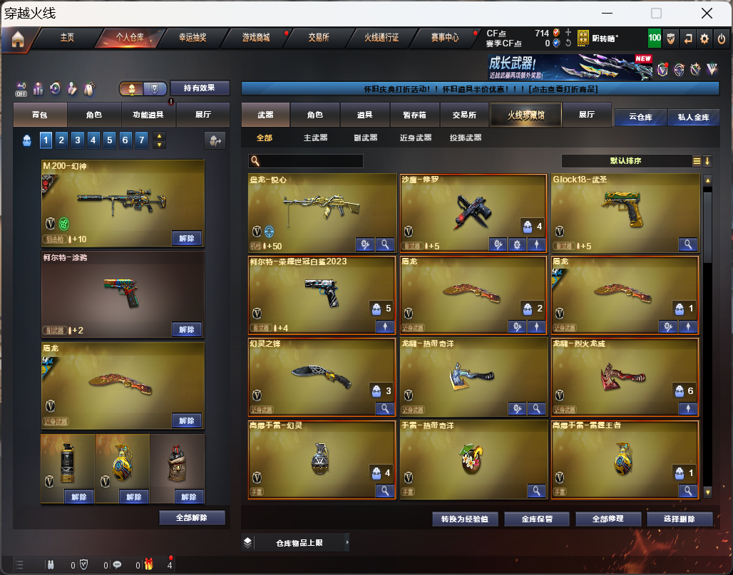 装备描述:王者武器:高爆手雷-雷霆王者;盘龙-悦心-觉醒版 英雄武器:柯尔特-荣耀世冠白鲨2023;超新星-热带奇洋;AK47-火麒麟;龙啸-热带奇洋;手雷-热带奇洋;黑武士-锦绣游龙;AN94-超新星;闪光弹-幻灵;M200-幻神;烟雾弹-幻灵;高爆手雷-幻灵;幻灵之锋;龙啸-烈火龙威;沙鹰-修罗;屠龙;M4A1-黑龙;QBZ03-金色蔷薇;M4A1-雷神;Barrett-毁灭;M4A1-武圣;Glock18-武圣 角色:猎狐者;飞虎队;潘多拉;雷霆-β;复仇者;堕天使;兰;夜玫瑰;救世复仇;潜龙队-X;暗夜-X;青霞仙子;艾比;娟娟;麻雀;圣诞潘多拉-X;代号:翼;幽;芳心审判者;风暴女;维纳斯;兰-限定版;游珑儿;芳心审判者;猎狐者-X 道具:绿色巨人;妖姬;绿色巨人;疯狂宝贝;防化服;C4工具钳;手雷包;防弹衣;防弹头盔;灵魂忍者;迷雾幽灵;疯狂宝贝;防化服;C4工具钳;手雷包;防弹衣;防弹头盔;毁灭者面具;天使光环;黄金头骨护目镜;超级背包;夺命之镰;防化服;迷雾幽灵;灵魂忍者;疯狂宝贝;枪口火焰变形;炫彩背包;全能枪王黄金面具;银蛇戒;M4A1-雷神蓝粉色光效;防弹头盔;C4工具钳;