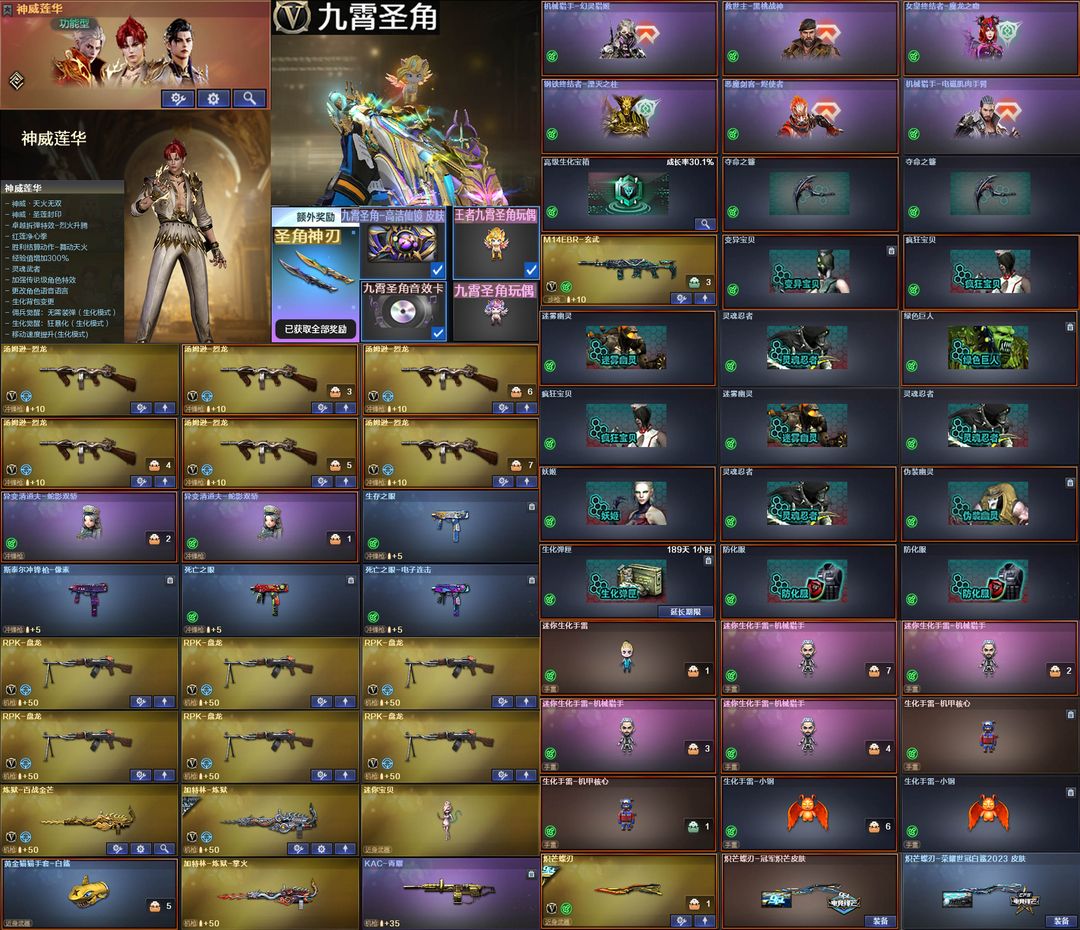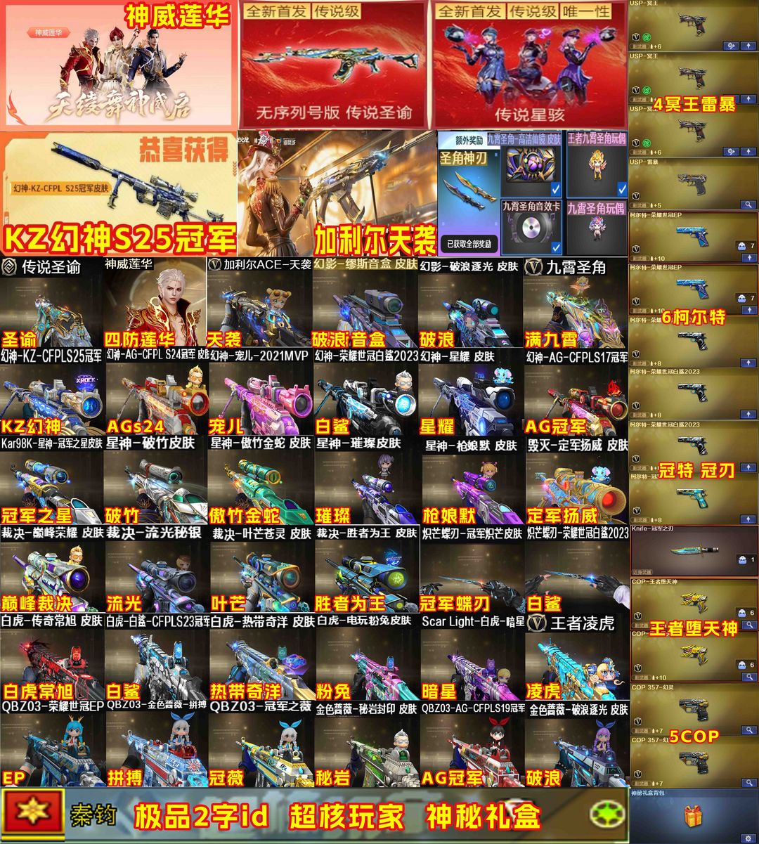 限制: 租号5次及以上 | 撤单率<50%才可租用此帐号装备描述:【装备道具】:神威莲华/传说星骇/传说圣谕/满配九霄圣角副武器大满配❤幻神-电流骇客/幻神-动感闪耀/幻神-KZ-CFPLS25冠军/幻神-AG-CFPL S24冠军/幻神-荣耀世冠白鲨2023/幻神-宠儿-2021MVP/幻神-AG-CFPLS17冠军/幻神-星耀/星神-傲竹金蛇/星神-冠军之星/星神-枪娘默/璀璨星神-破竹/毁灭-极地霜雄/极光-高能霹雳/胜者为王裁决-叶芒苍灵/裁决-流光秘银/裁决-巅峰荣耀/九霄圣角-高洁仙镜/荣耀之魄雷神-拼搏/幻影-缪斯音盒/幻影-破浪逐光/秘岩封印金色蔷薇破浪逐光/白鲨白虎-传奇常旭/白虎-暗星/电玩粉兔白虎-热带奇洋/AG冠军QBZ-荣耀世冠EP/冠军之薇/金色蔷薇-拼搏/冠军炽芒蝶刃白鲨❤加利尔ACE-天袭/炽渊之怒/柯尔特-荣耀世冠EP(2)/USP-冥王/柯尔特白鲨/柯尔特-冠军之特/USP-雷暴//M14EBR-玄武❤幻神音效卡/星神音效卡/天罚音效卡/白虎音效卡/九霄圣角音效卡/毁灭音效卡/裁决音效卡/炼狱百战金芒音效卡❤异变清道夫-蛇影双骄❤妮妮/玄豹/王者雷影/王者凌虎/凤吟之魄/王者雷怒/COP-王者堕天神/圣角神刃