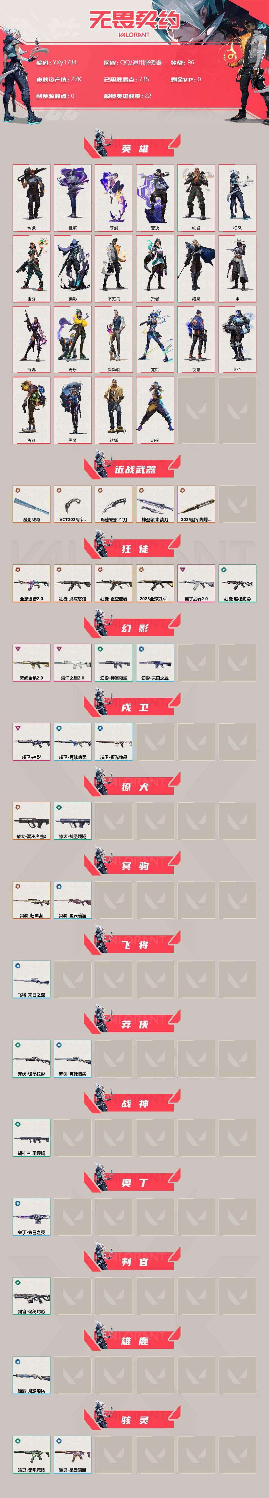 装备描述:【套装】:2025全球冠军赛套装,VCT 2025 赛季套装 【英雄】:幻棱,炼狱,维斯,暮蝶,钛狐,壹决,铁臂,捷风,雷兹,幽影,不死鸟,贤者,猎枭,零,芮娜,奇乐,尚勃勒,霓虹,夜露,K/O,盖可,黑梦 【近战 武器】:近战武器-2025全球冠军赛 蝴蝶刀,近战武器-VCT 2025 爪刀,近战武器-澄湖潋滟,近战武器-诡秘蛇影 军刀,近战武器-神圣领域 战刀 【狂徒】:狂徒-2025全球冠军赛,狂徒-洪荒怒焰,狂徒-全息波普//2.0,狂徒-虚空遗器,狂徒-离子武器//2.0,狂徒-诡秘蛇影 【幻影】:幻影-紫阙金琅//2.0,幻影-海洋之星//2.0,幻影-神圣领域,幻影-末日之翼 【戍卫】:戍卫-掠影,戍卫-月球哨兵,戍卫-折光棱晶 【獠犬】:獠犬-混沌序曲//2.0,獠犬-神圣领域 【冥驹】:冥驹-归零者,冥驹-星云暗涌 【飞将】:飞将-末日之翼 【莽侠】:莽侠-诡秘蛇影,莽侠-月球哨兵 【战神】:战神-神圣领域 【奥丁】:奥丁-末日之翼 【判官】:判官-诡秘蛇影 【雄鹿】:雄鹿-月球哨兵 【骇灵】:骇灵-无限竞技,骇灵-星云暗涌 【蜂刺】:蜂刺-星云暗涌,蜂刺-折光棱晶
