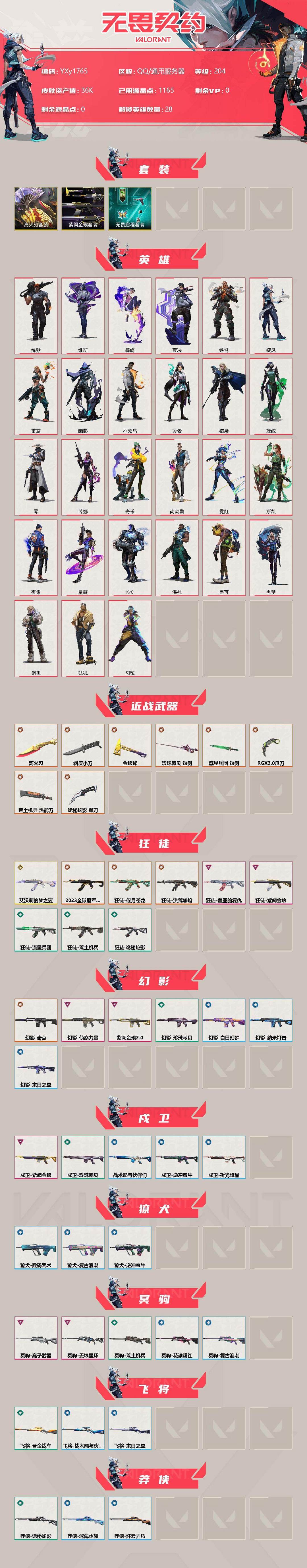 装备描述:【套装】:离火刃套装,离火刃套装,紫阙金琅套装,无畏启程套装 【英雄】:幻棱,炼狱,维斯,暮蝶,钛狐,壹决,铁臂,捷风,雷兹,幽影,不死鸟,贤者,猎枭,蝰蛇,零,芮娜,奇乐,尚勃勒,霓虹,斯凯,夜露,星礈,K/O,海神,盖可,黑梦,钢锁 【近战 武器】:近战武器-剥皮小刀,近战武器-RGX 11z Pro//3.0 爪刀,近战武器-离火刃,近战武器-珍珠棘贝 短剑,近战武器-流星兵团 短剑,近战武器-荒土机兵 热能刀,近战武器-金琅斧,近战武器-诡秘蛇影 军刀 【狂徒】:狂徒-艾沃莉的梦之翼,狂徒-2023全球冠军赛,狂徒-洪荒怒焰,狂徒-偃月苍龙,狂徒-盖亚的复仇,狂徒-紫阙金琅,狂徒-荒土机兵,狂徒-流星兵团,狂徒-诡秘蛇影 【幻影】:幻影-奇点,幻影-侦察力量,幻影-紫阙金琅//2.0,幻影-珍珠棘贝,幻影-白日幻梦,幻影-纳米打击,幻影-末日之翼 【戍卫】:戍卫-紫阙金琅,戍卫-珍珠棘贝,戍卫-逆冲蛮牛,戍卫-战术熊与伙伴们,戍卫-折光棱晶 【獠犬】:獠犬-复古浪潮,獠犬-逆冲蛮牛,獠犬-数码咒术 【冥驹】:冥驹-离子武器,冥驹-无垠星环,冥驹-荒土机兵,冥驹-复古浪潮,冥驹-