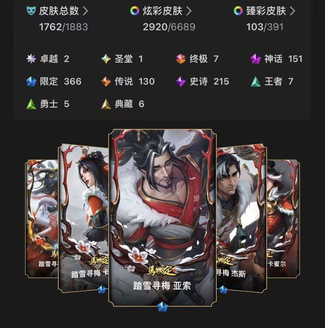 装备描述:全英雄,9500皮肤。至臻全套,全海克斯,八色龙瞎。全年限,全周年。