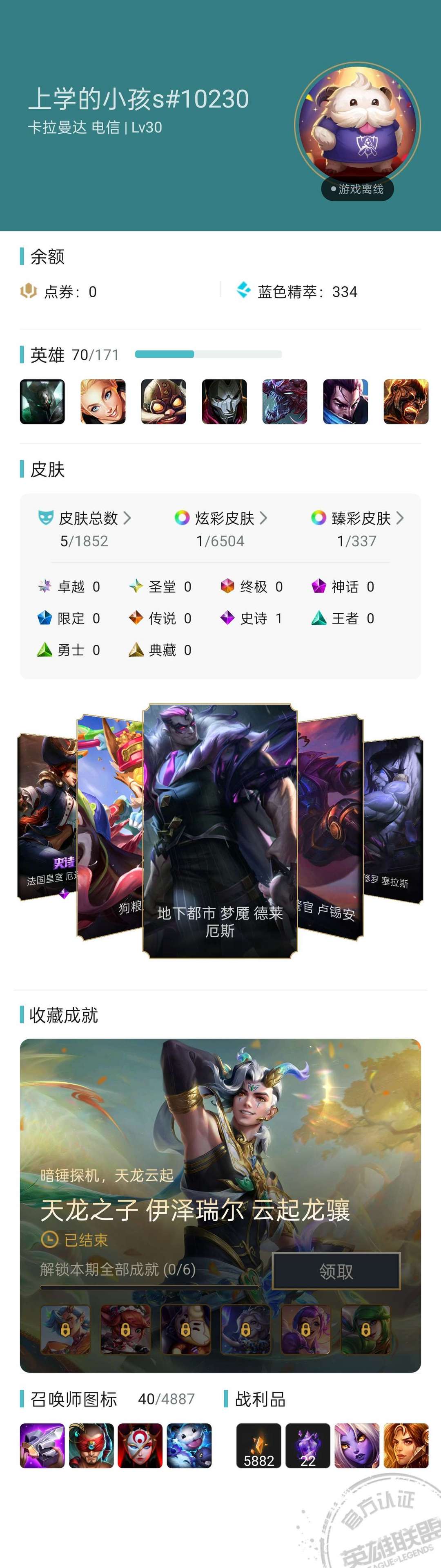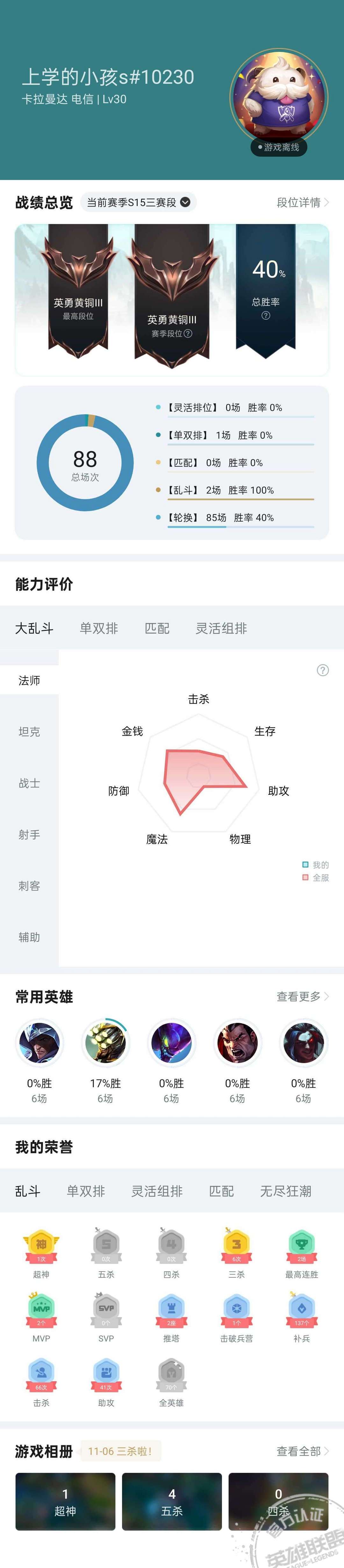 装备描述:低分段虐菜炸鱼号 开黑带妹陪玩练英雄均可 请文明游戏 不要恶意挂机逃跑送人头 不要喷人 素质为美 开心畅玩