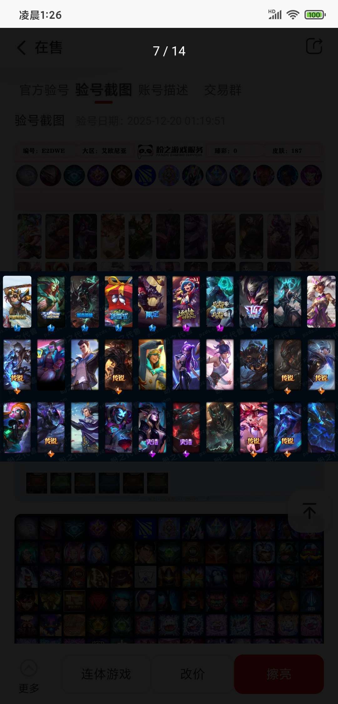 装备描述:禁止利用账号进行开挂、使用辅助违规软件诈骗等违规操作。 【重要皮肤】电玩勇者锐雯 替父从军花木兰 碧玉之牙卡西奥佩娅 美猴王孙悟空 定海神珍孙悟空 紫金罗刹莫甘娜 广寒仙子嫦娥 司马懿仲达 胜利机器人布里茨 胜利女神奥莉安娜 胜利枪神卢锡安 胜利之剑亚托克斯 平安夜女神娑娜 SSW图奇 SSW辛吉德 暗杀星蒙多 冰雪节辛吉德 冠军之血希瓦娜 鬼影森森茂凯 鬼影重重魔腾 海贼瑞兹 胡桃夹子萨科 蓝色忧郁崔斯特 密林猎手提莫 圣诞精灵崔丝塔娜 圣诞开心鬼提莫 圣诞狂欢基兰 圣诞驯鹿克格莫 喜庆之树茂凯 雪默丁格 野兽猎人泰达米尔 永恒之森乐芙兰 暗影沃里克 阿木木主人不要我了 都铎王朝图奇 十周年纪念安妮 源代码乐芙兰 暗裔英雄盖伦 【传说皮肤】驯龙炮手崔丝塔娜 神龙尊者圣龙李青 源计划联合艾希 西部魔影卢锡安 源计划净化薇恩 星之守护者金克丝 地狱之门卫士加里奥 魔幻卡牌崔斯特 双重冰晶艾尼维亚 女主播迦娜 恶魔男爵瑞兹 绅士科加斯 律政大亨蒙多 符文战熊狗熊 电玩女神娑娜 第三类接触黑默丁格 女皇艾希 铁哥们儿奥拉夫 黑夜使者亚索 黎明使者锐雯