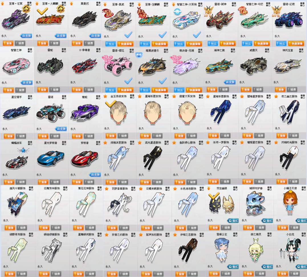 装备描述:6S 29满四至尊真武 29双四至尊玉麒麟 29双四黑曼巴 29双四智慧之神句芒/大耳狗 29X-争锋者 雷蛇 T2孙悟空 3T1:侍武之魂 启灵守护神 超能特警 29A 29双四永久普通雷诺-樱花皮肤 卧龙雷诺 镇海之戟 女装53页:动作套:(璀璨星芒 熊猫警探 落雁归云 天降良缘 烟梦夜纱 秀丽天青 絮声如初)花醉仙蓉悬浮 月夜流星悬浮 男装47页:羽梦音章悬浮 夜之幽兰悬浮 动作套:(冰河一梦 碧海星梦璀璨星芒 絮声如初) 金鱼头 星海头 甜蜜大耳头 双生幽狼强化10 紫钻27年6月钻皇28年8月