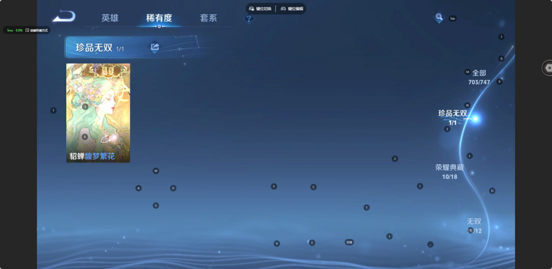 装备描述:无双V10♥703皮♥10典藏♥11无双♥9珍品♥1珍品无双♥122传说♥馥梦繁花♥幻阙歌♥青丘九尾