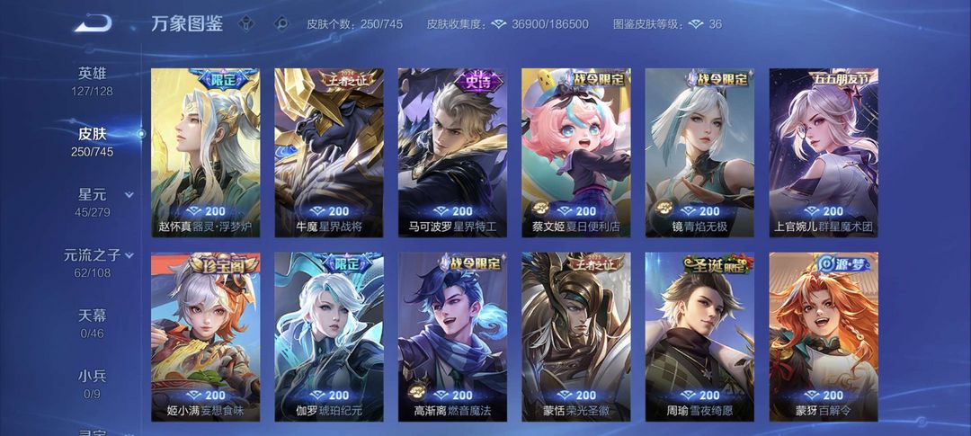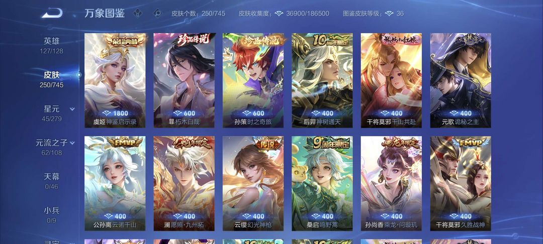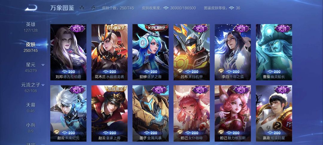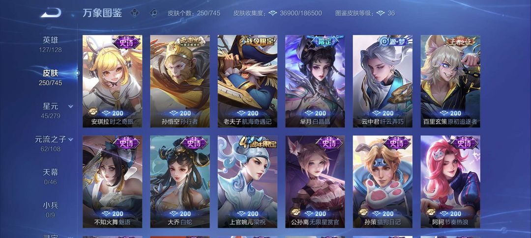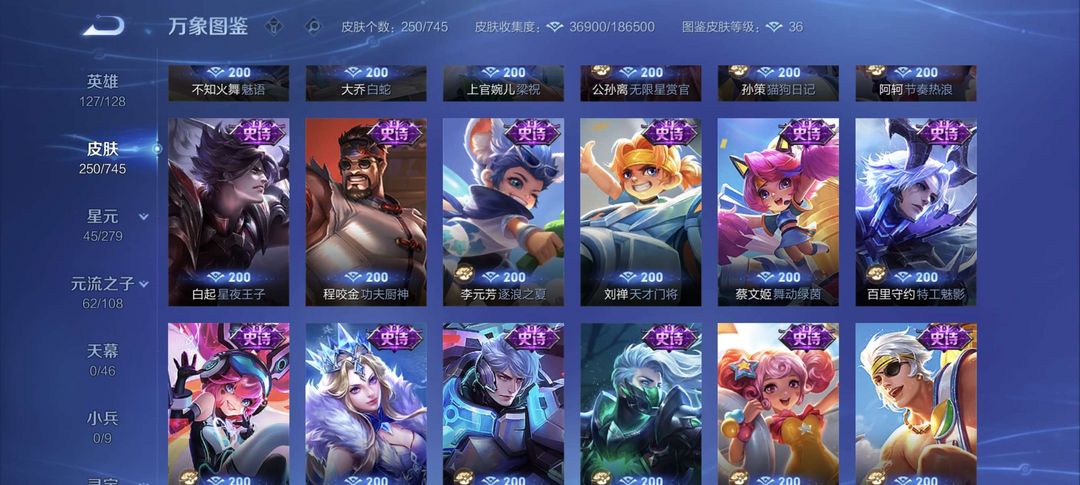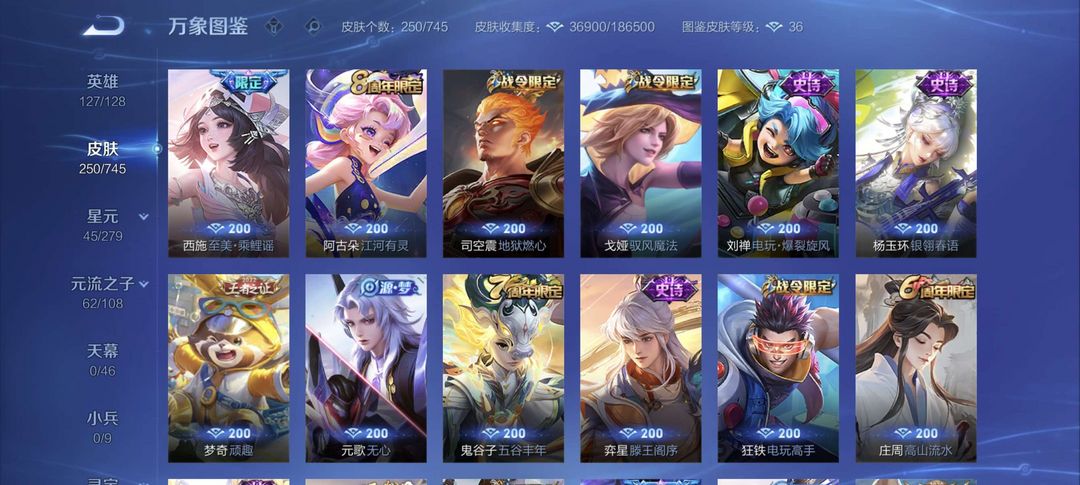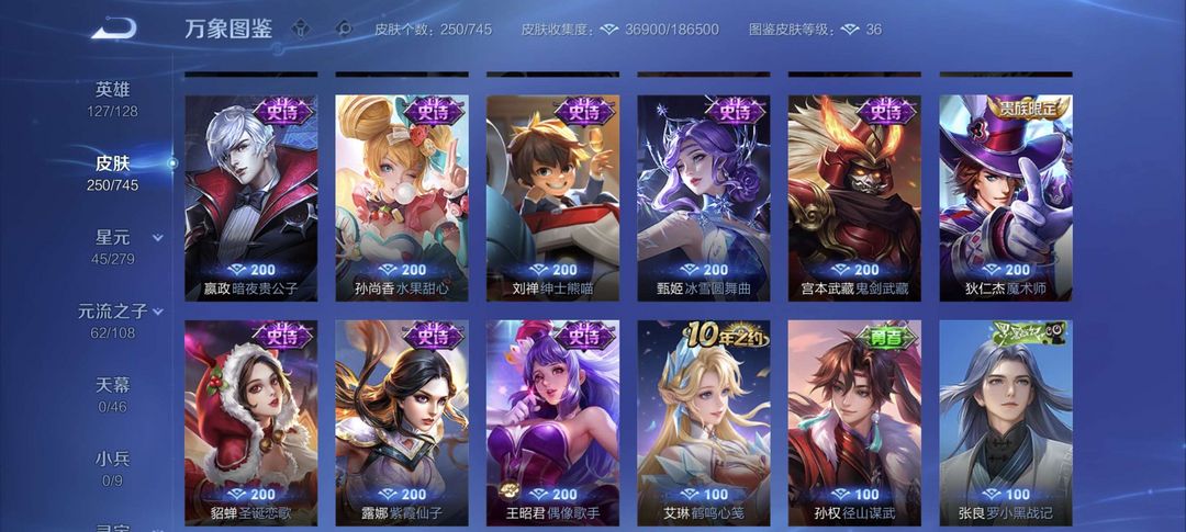 装备描述:该账号拥有250款精美皮肤,涵盖多品质珍稀款式,满足您的多样游戏需求。 - 荣耀典藏:虞姬·神鉴启示录,特效华丽,建模仙气十足,技能释放如史诗大片,是收藏与实战的双重优选。 - 传说品质:孙策·时之奇旅,风格潮流酷炫,技能特效充满科技感;貂蝉·仲夏夜之梦,经典传说皮,技能梦幻,手感丝滑;宫本武藏·地狱之眼,霸气外观搭配震撼音效,开大瞬间尽显战神风范。 - 限定系列:后羿·神树通天(10周年限定),特效融合神话元素,纪念意义拉满;干将莫邪·千山共赴(狐妖小红娘联动),联动IP情怀满满,技能特效浪漫唯美;孙尚香·乘龙·问璇玑(龙年限定),龙元素特效霸气侧漏,建模精致华丽。 - FMVP皮肤:公孙离·云诺千山、干将莫邪·久胜战神,均为职业赛场荣誉之作,特效设计极具选手风格,实战辨识度与操作手感俱佳。 - 史诗皮肤:数量丰富,如不知火舞·魅语,建模飒爽,技能打击感超强;大乔·白蛇,国风韵味十足,技能特效充满意境;李白·千年之狐,特效华丽且手感轻盈,是李白玩家的心头好。还有众多战令限定、源·梦系列等优质史诗皮,品质在线,玩法多样。 星元 宫本武藏幽灵之眼,貂蝉 仲夏夜之梦,赵云 未来纪元等
