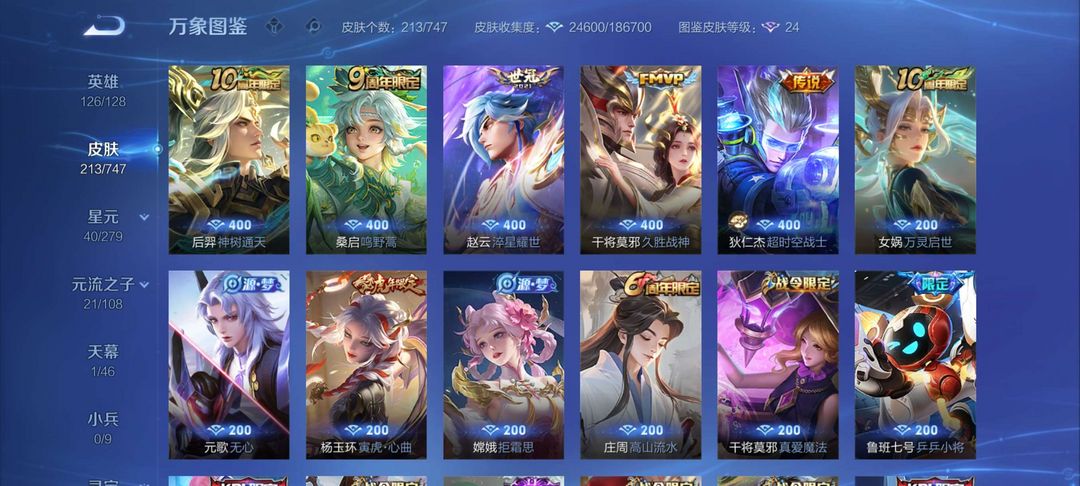 126个英雄除了小龙人和武则天没,其他都有,213个皮肤传说皮肤有赵云,干将,狄仁杰等