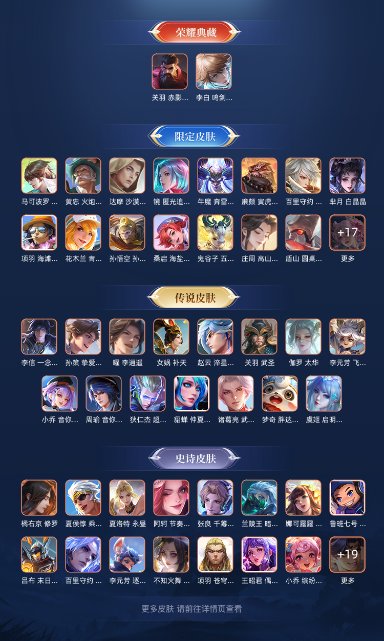 装备描述:私人所属英雄皮肤有:李白 鸣剑·曳影周瑜 音你心动梦奇 胖达荣荣李信 一念神魔关羽 武圣诸葛亮 武陵仙君李元芳 飞鸢探春狄仁杰 超时空战士虞姬 启明星使貂蝉 仲夏夜之梦孙策 挚爱之约赵云 淬星耀世女娲 补天曜 李逍遥小乔 音你心动裴擒虎 寅虎·赤拳伽罗 太华等等禁止利用账号进行开挂、使用辅助违规软件诈骗等违规操作