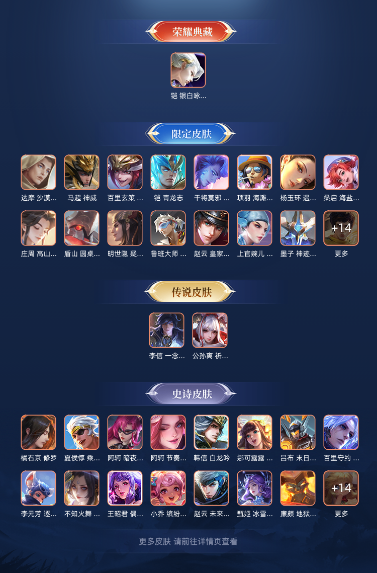 凯的荣耀典藏,孙策珍品传说,一念神魔,祁雪灵祝,冰雪圆舞曲,久胜将军,各周年限定,五虎上将,云鹰飞将