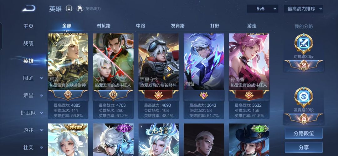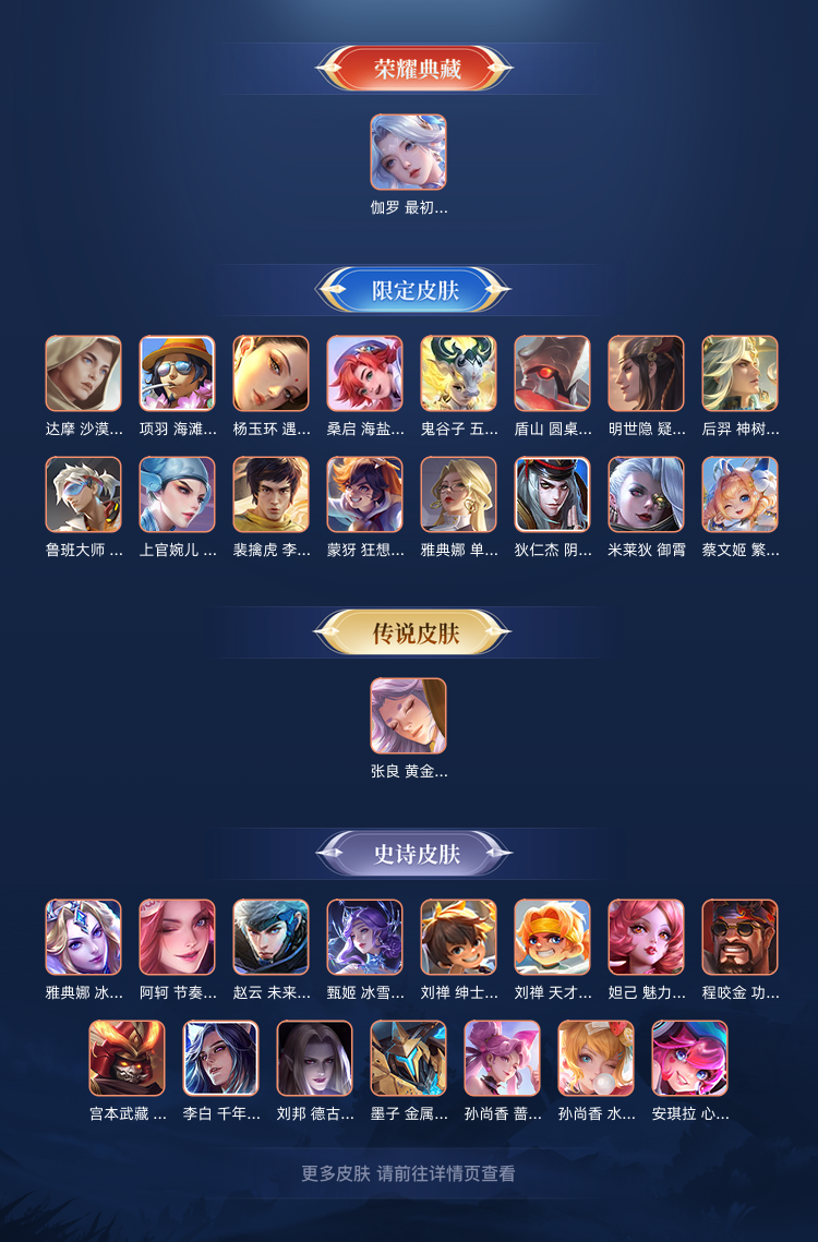 街头霸王-韩信,节奏热浪-阿轲,黄金白羊座-张良,最初的交响-伽罗,神树通天-后羿,鹤鸣心戈-艾琳,