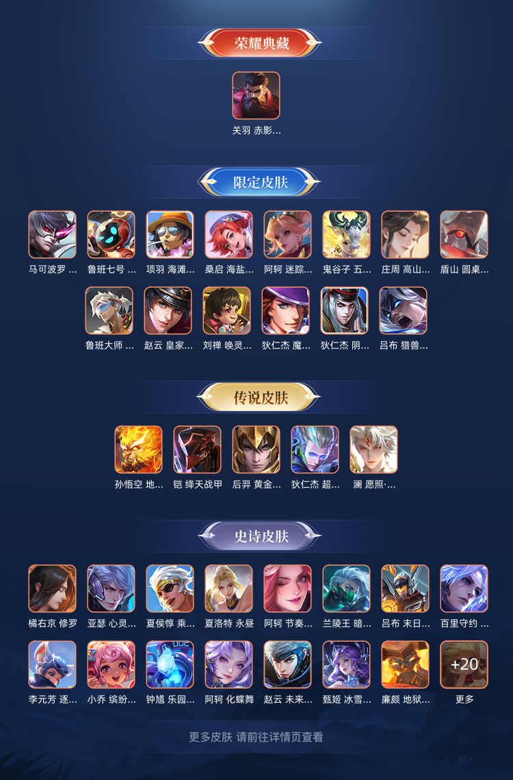 限制: 撤单率<50%才可租用此帐号装备描述:关羽荣耀典藏 赤影疾锋+各种传说皮肤+各种史诗皮肤