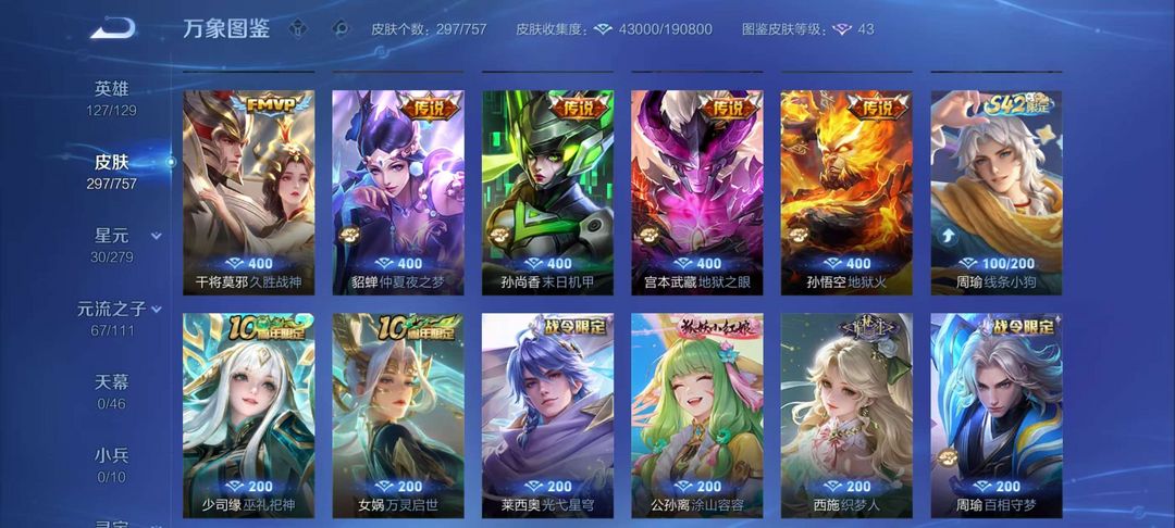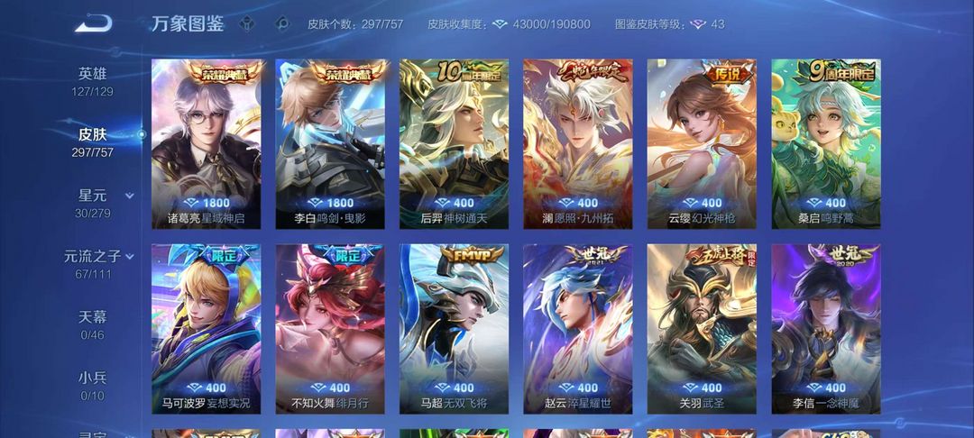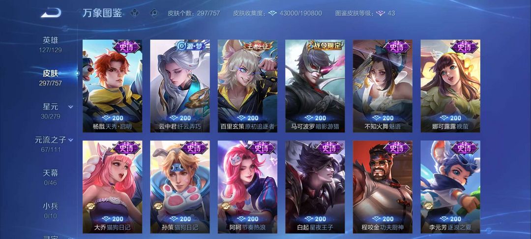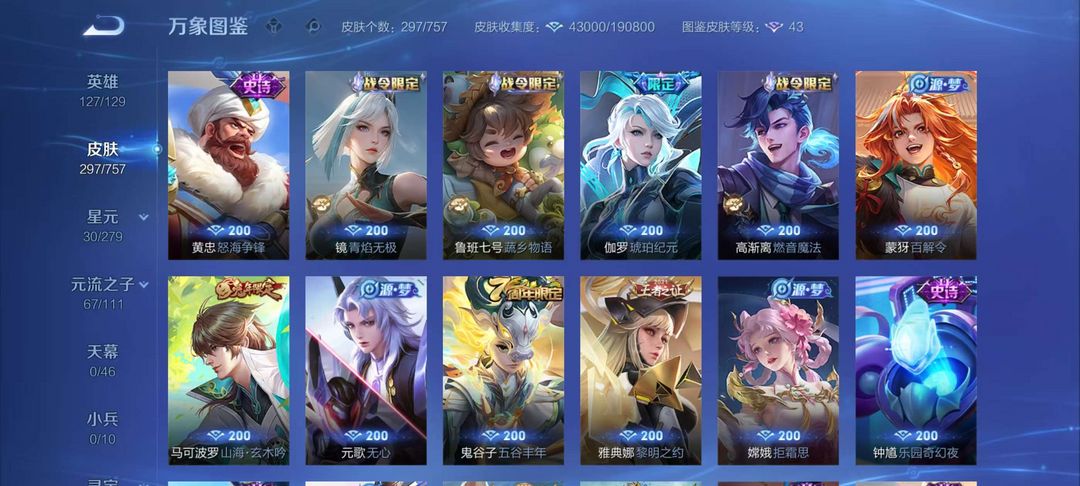 安卓297皮肤两典藏 多高价值皮肤