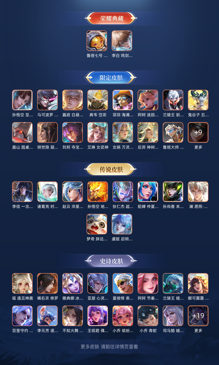 装备描述:李白的荣耀典藏鲁班的荣耀典藏猴子的至尊宝,还有很多传说皮