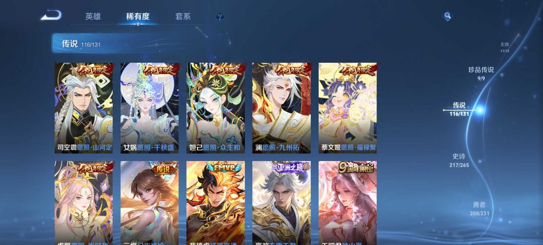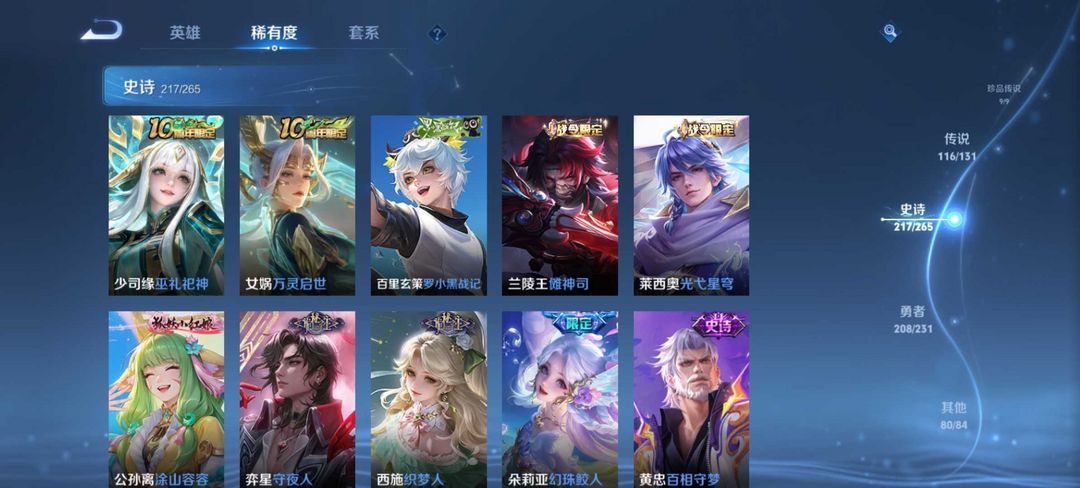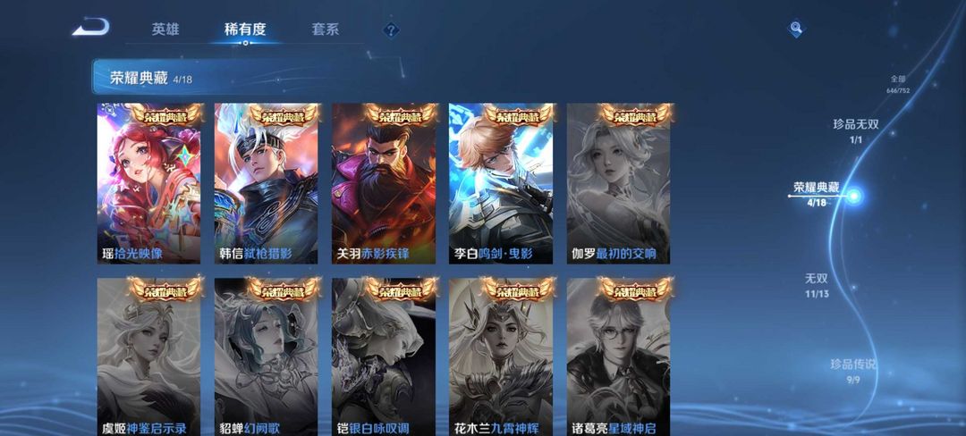 无双贵族647皮★4典藏11无双★9珍品传说★瑶拾光印象★铠神罪雪宝小兵★大耳狗瑶★貂蝉馥梦繁花