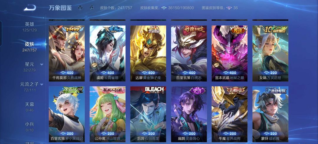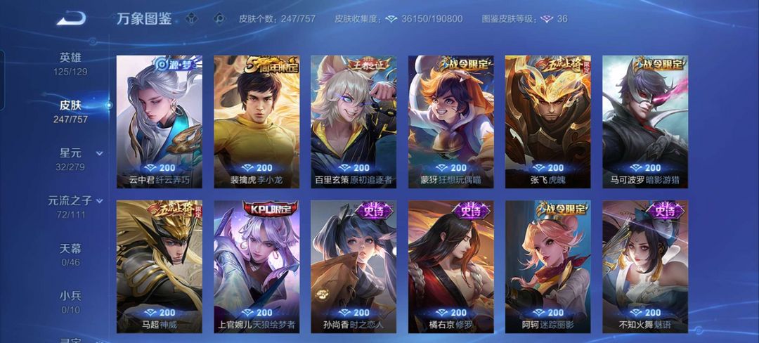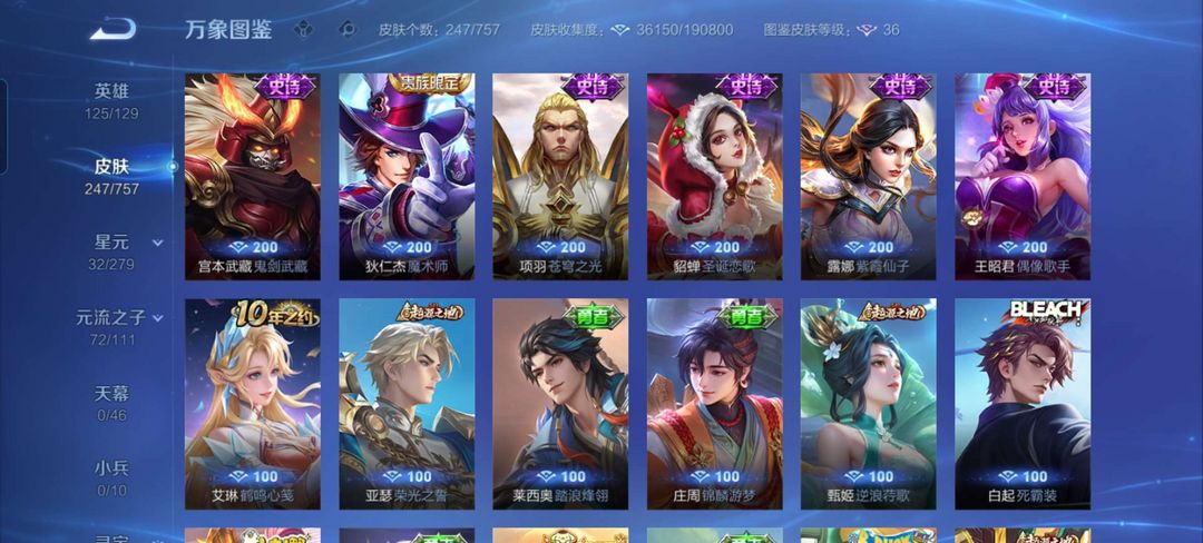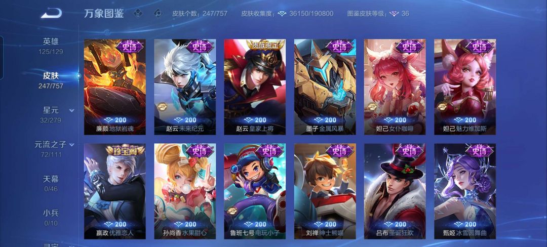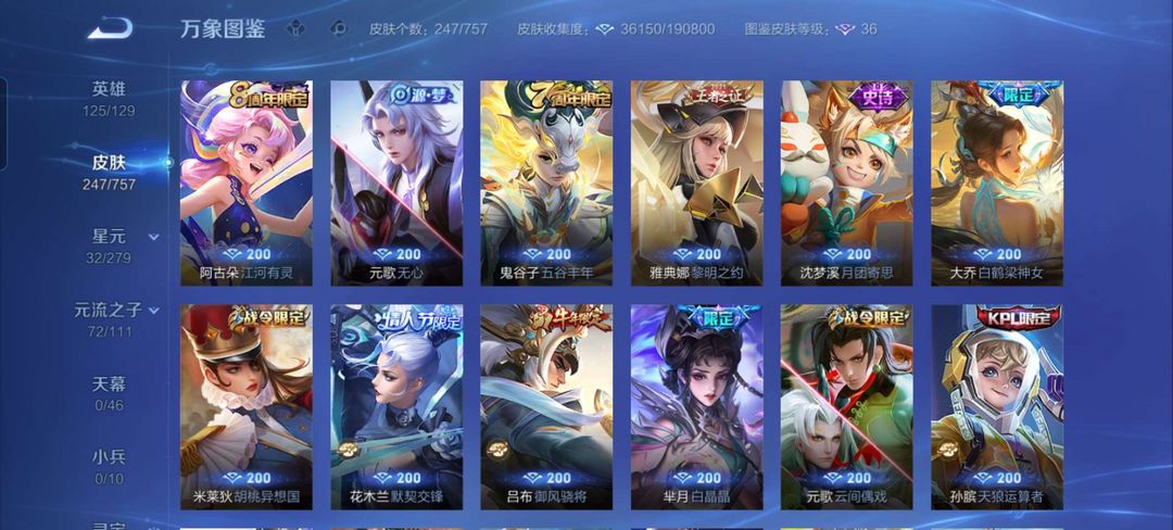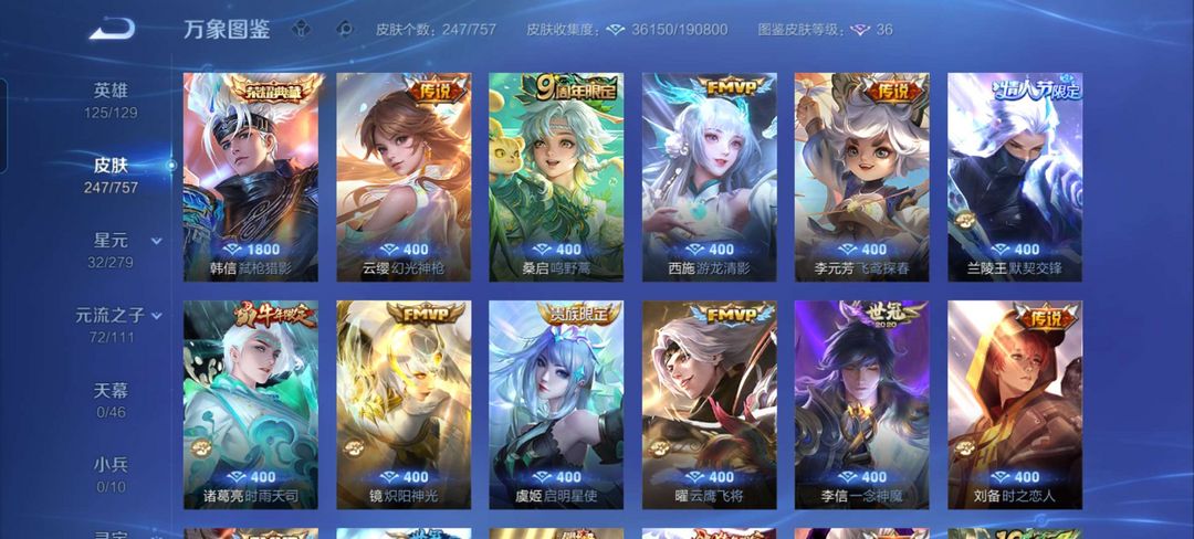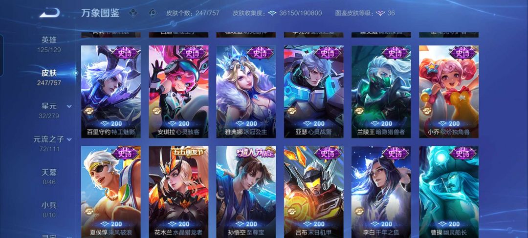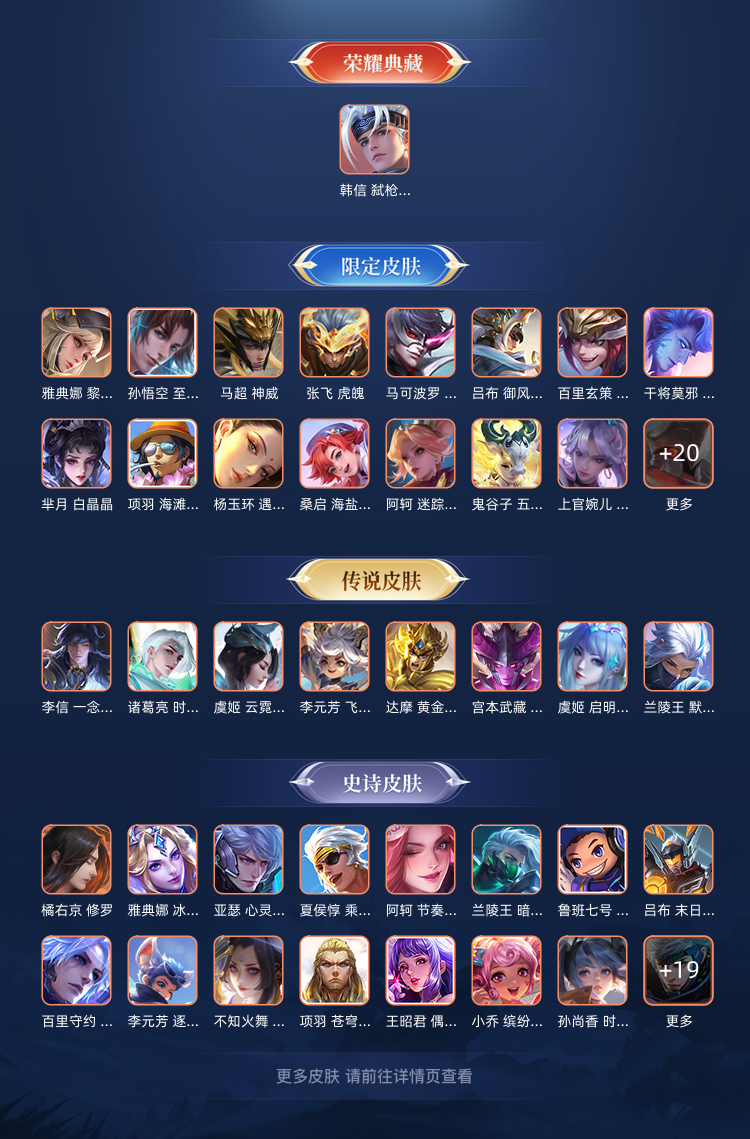 装备描述:- 韩信·弑枪猎影 - 桑启·鸣野蒿(9周年) - 女娲·万灵后世(10周年) - 阿古朵·江河有灵(8周年) - 鬼谷子·五谷丰年(7周年) - 上官婉儿·梁祝(4周年) - 杨玉环·遇见飞天(3周年) - 兰陵王·默契交锋、花木兰·默契交锋 - 孙悟空·至尊宝 - 干将莫邪·冰霜恋舞曲 西施·游龙清影、镜·炽阳神光、曜·云鹰飞将、干将莫邪·久胜战神、李信·一念神魔 孙膑·天狼运算者、上官婉儿·天狼绘梦者 虞姬·云霓雀翎、李信·一念神魔 诸葛亮·时雨天司(牛年限定) - 吕布·御风骁将(牛年限定) - 张飞·虎魄(五虎上将限定) - 马超·神威(五虎上将限定) - 艾琳·鹤鸣心笺(10年之约限定) - 妲己·女仆咖啡(优化后史诗,原勇者但获取方式
