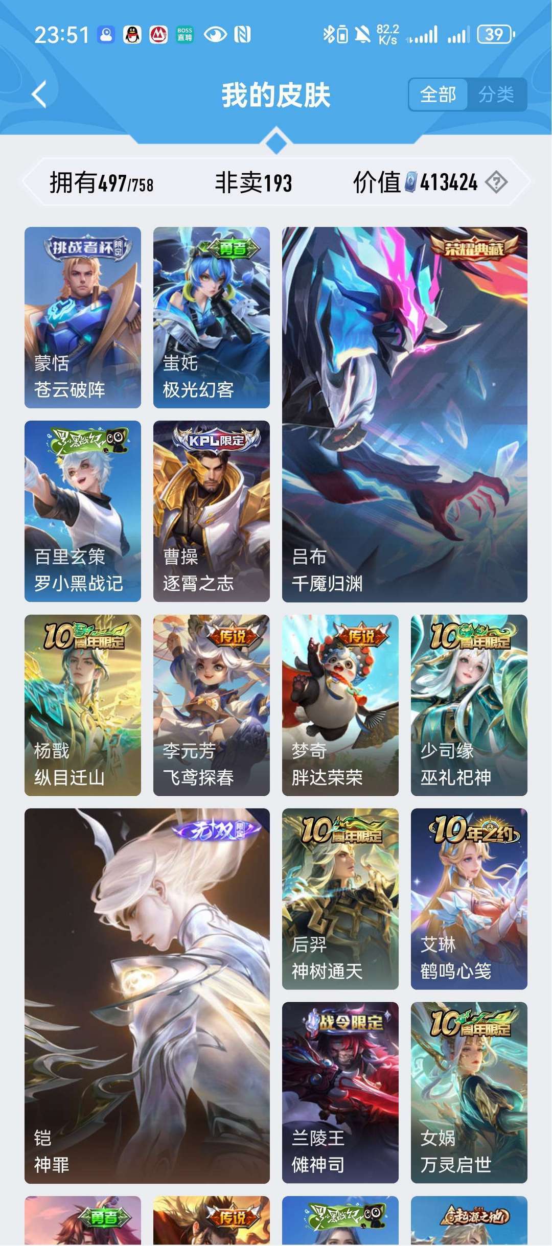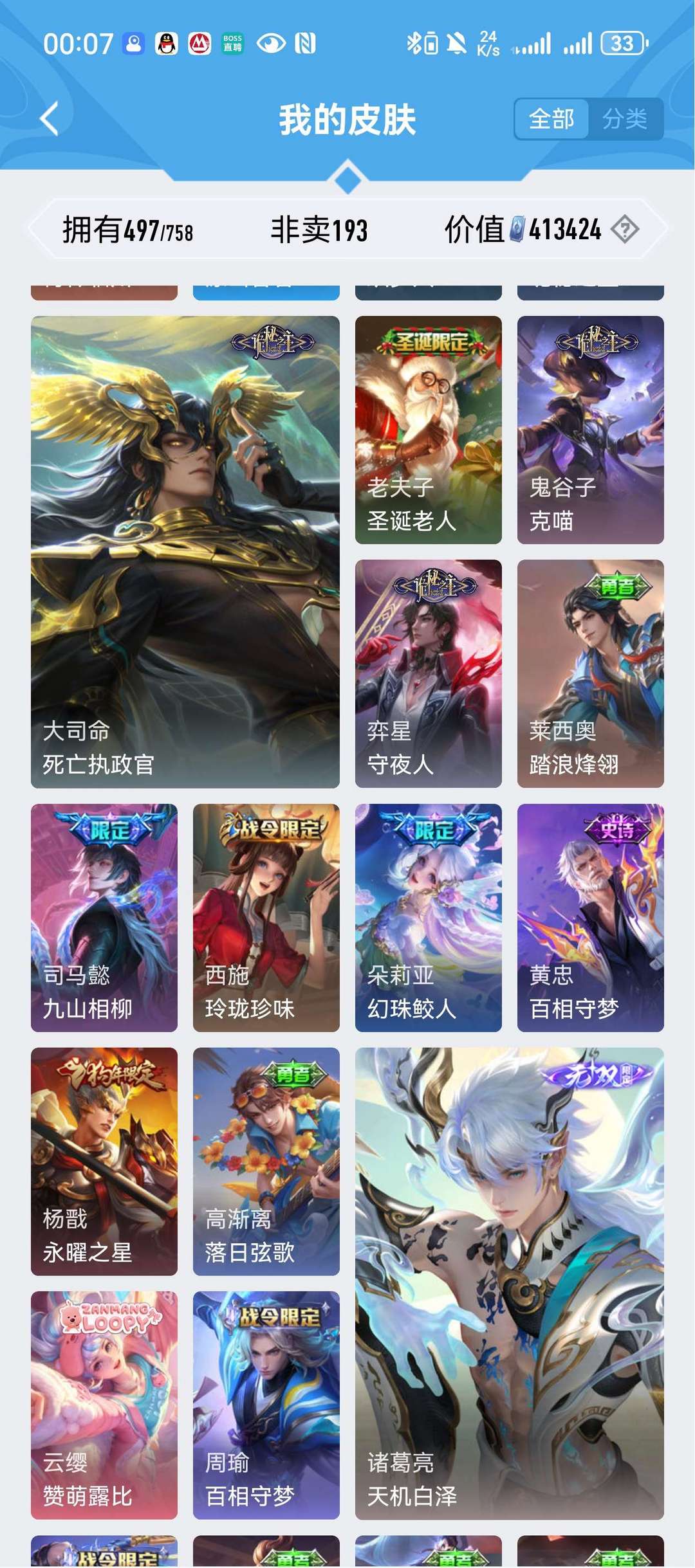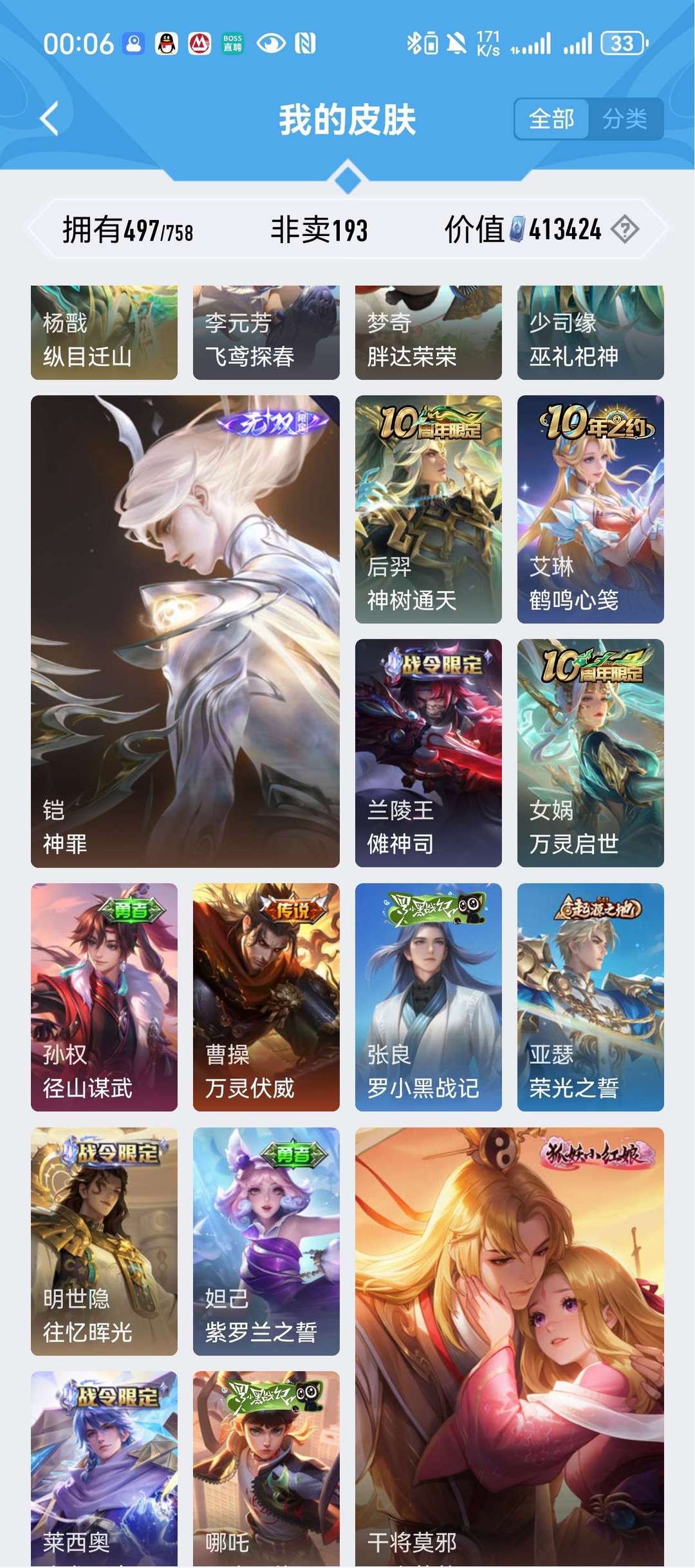吕布新典藏李白典藏伽罗典藏老夫子圣诞老人凯诸葛亮火舞耀等等多个无双皮肤多个珍品传说501个皮肤