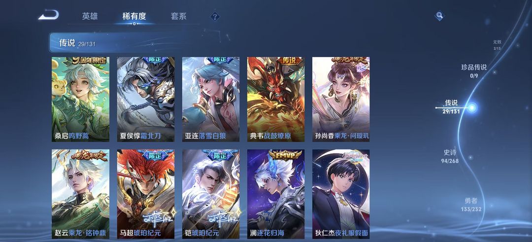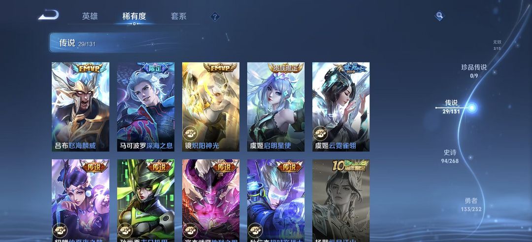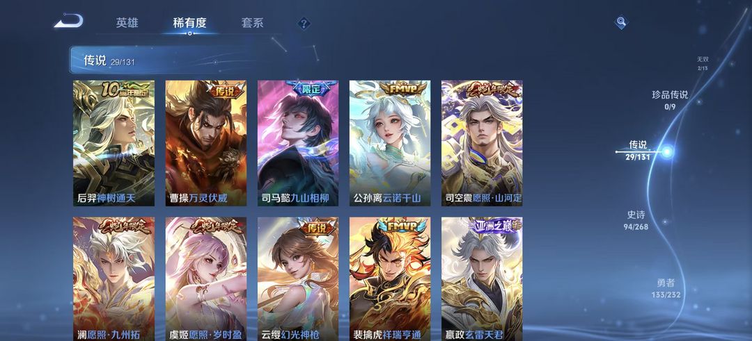 装备描述:274皮肤-孙尚香乘龙.问璇玑 典韦战鼓燎原 狄仁杰夜礼服假面 澜逐花归海 铠琥珀纪元 司马懿九山相柳 公孙离云诺干山 司空震愿照.山河定 赢政玄雷天君 裴擒虎祥瑞亨通 镜炽阳神光 吕布怒海麟威