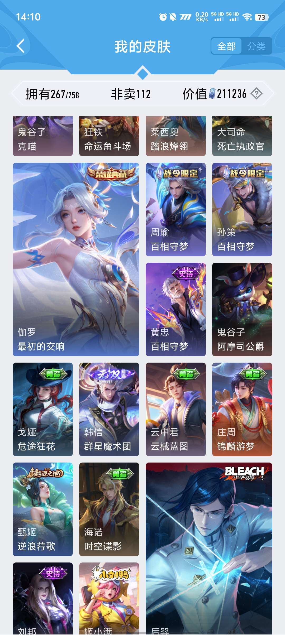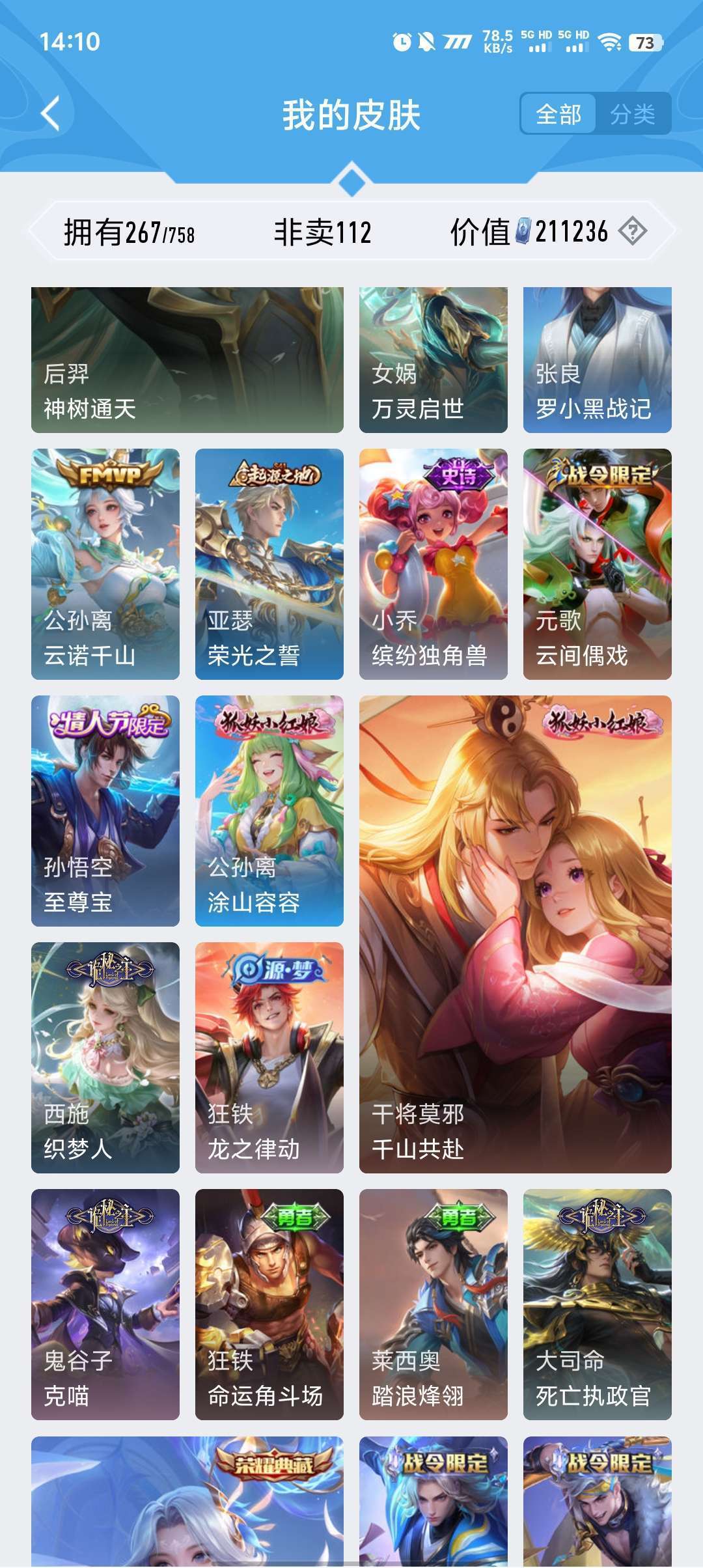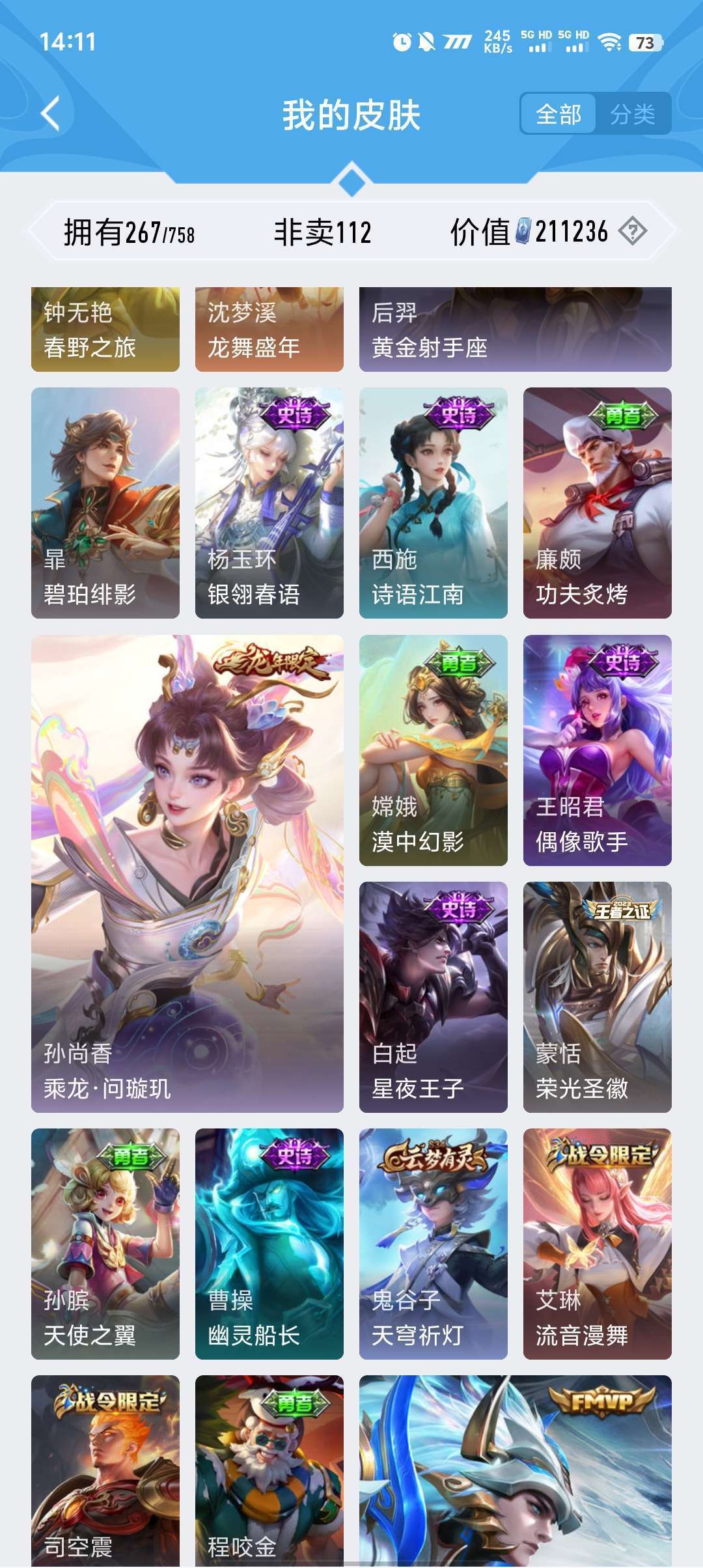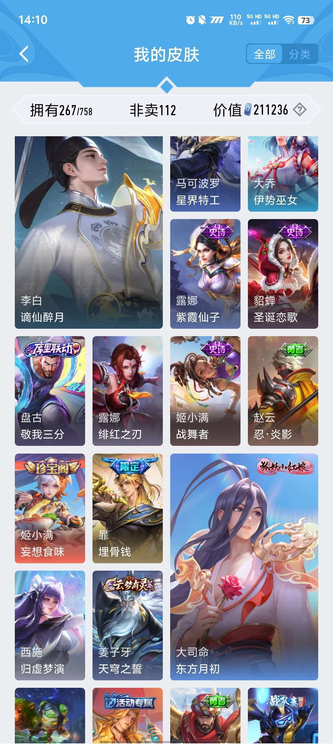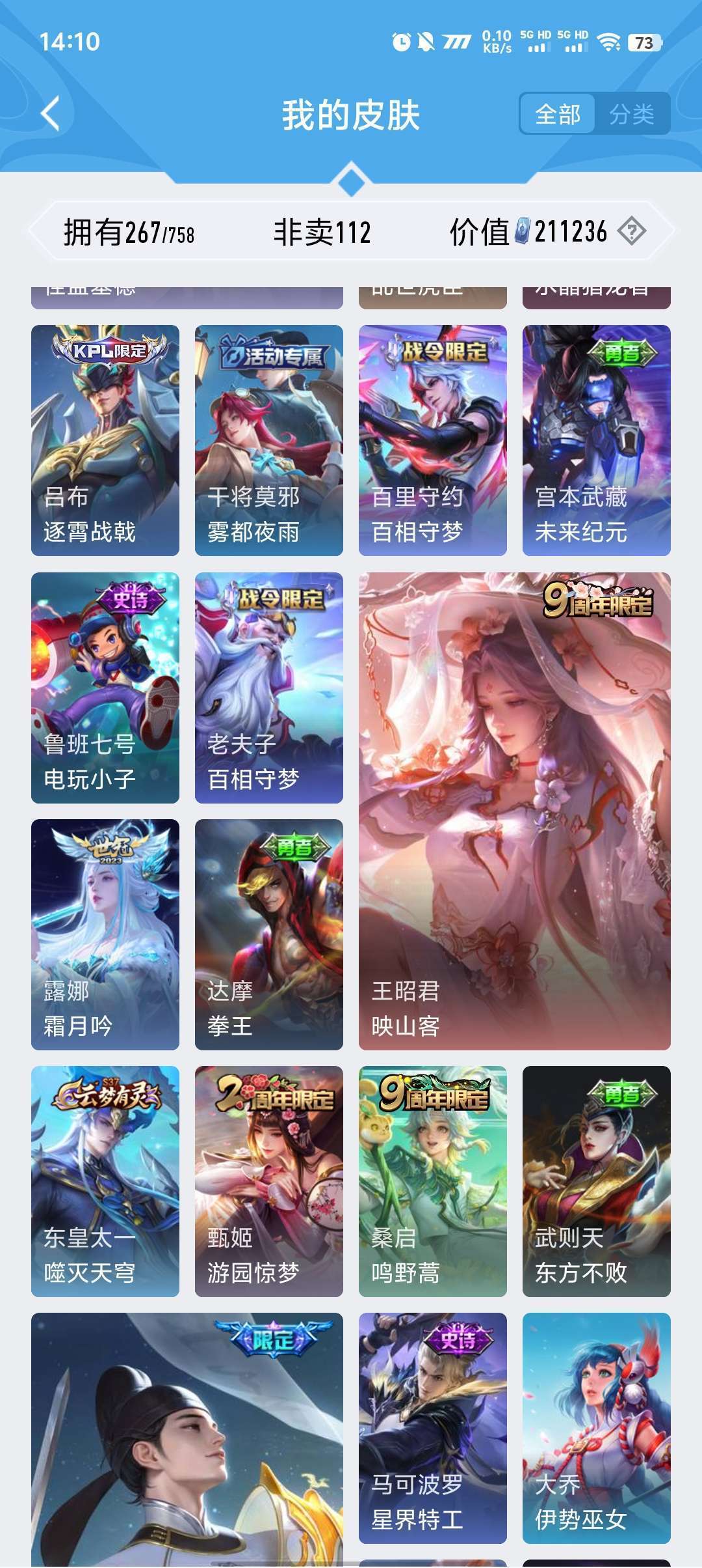 【V8 267皮】1典藏✔1无双✔1珍品✔21传说李信 山海·炽霜斩后羿 黄金射手座澜 电玩·雷克斯