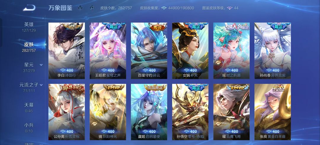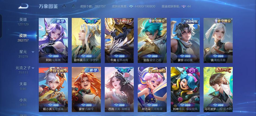 装备描述:281皮肤-瑶拾光映像 瑶大耳狗之梦 蔡文姬愿照.福禄聚 王昭君映山客 夏洛特浮生妄 项羽无限倾心 虞姬 无限倾心 小乔山海.琳琅生 李信山海.炽霜斩 曜山海.苍雷引 孙悟空零号.赤焰 李白诗剑行 孙尚香异界灵契 西施至美.乘鲤谣