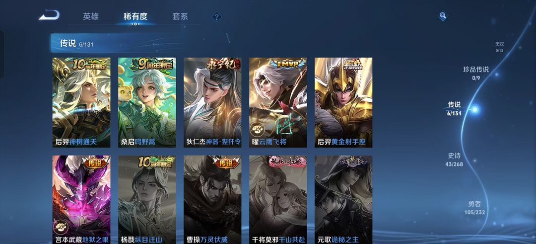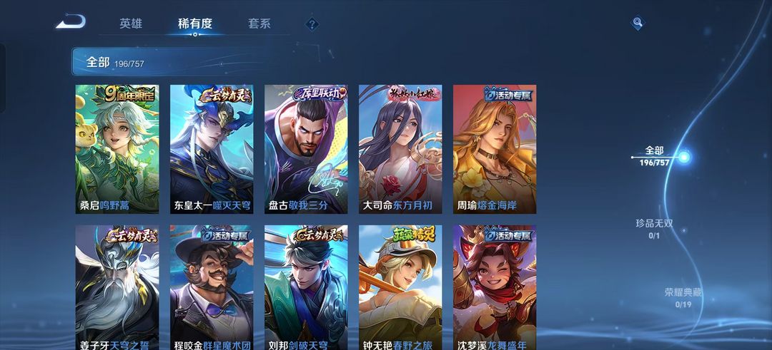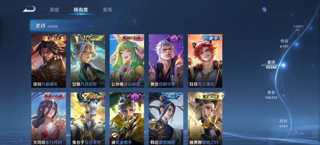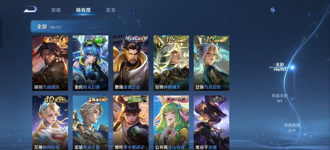 装备描述:176皮肤-韩信傲雪梅枪 宫本武藏地狱之眼 蚩姹极光幻客 猴子至尊宝 大司命 东方月初 后羿黄金射手座 狄仁杰 狴犴令 曜 云鹰飞将 澜 赏金猎手 含金 街霸