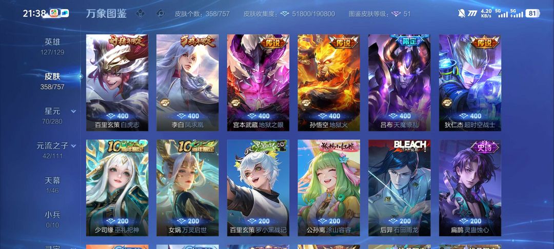 装备描述:主打野号超多限定皮肤,基本英雄都有皮肤。