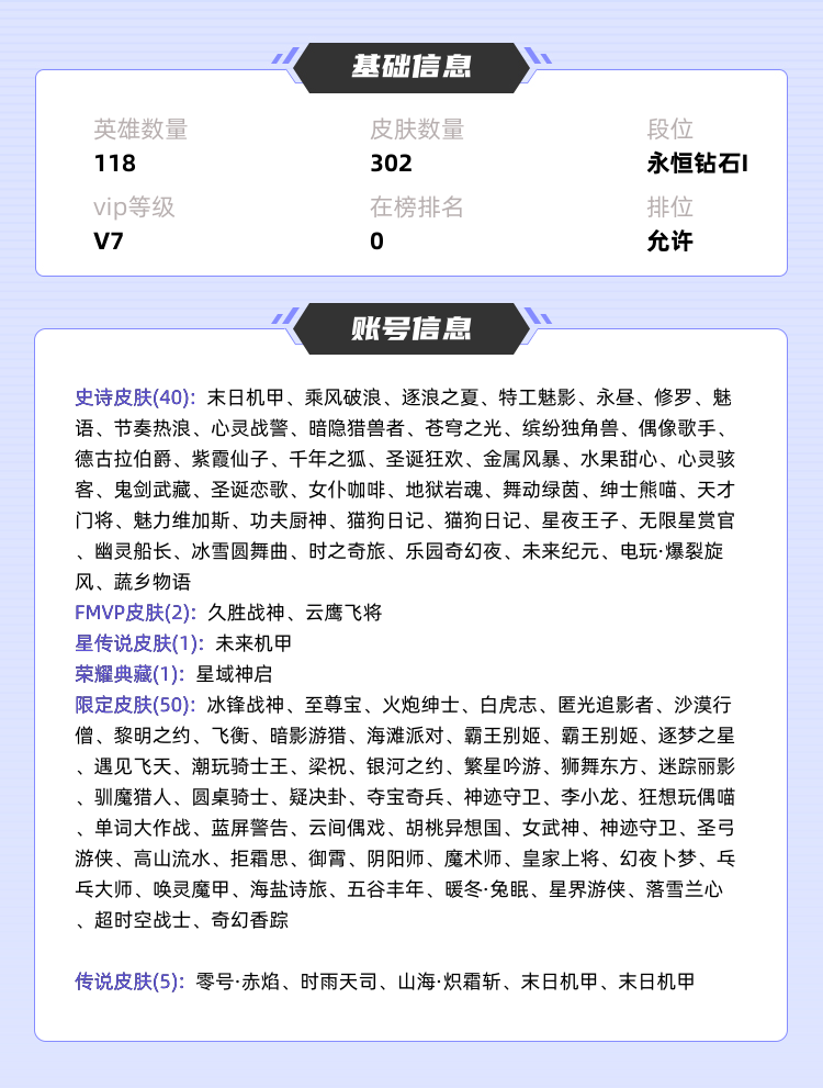限制: 租号3次及以上 | 撤单率<10%才可租用此帐号装备描述:>>>>>>毁号,涉及毁坏虚拟财产罪及计算机安全罪,请文明游戏素质游戏,让我们共建美好租号平台>>>>>> 本游戏账号: ,英雄多,皮肤多。典藏皮肤1个,感受典藏皮肤带来的优质体验快感,FMVP皮肤2个,尽情享受FMVP皮肤带来的主角光环, 私人所属英雄皮肤有:诸葛亮 星域神启李信 山海·炽霜斩||孙尚香 末日机甲||诸葛亮 时雨天司||孙悟空 零号·赤焰||孙策 末日机甲干将莫邪 久胜战神||曜 云鹰飞将鲁班大师 乓乓大师||杨戬 潮玩骑兵||达摩 沙漠行僧||暃 星界游侠||关羽 冰锋战神||阿轲 迷踪丽影||蒙犽 狂想玩偶喵||杨玉环 遇见飞天||芈月 幻夜卜梦||戈娅 驭风魔法||上官婉儿 梁祝||孙悟空 至尊宝||鬼谷子 五谷丰年||李元芳 妄想特派||李元芳 银河之约||镜 匿光追影者||庄周 高山流水||明世隐 疑决卦||桑启 海盐诗旅||嫦娥 拒霜思||嫦娥 暖冬·兔眠||韩信 飞衡||墨子 神迹守卫||狄仁杰 魔术师||狄仁杰 阴阳师||后羿 圣弓游侠||刘邦 夺宝奇兵||百里玄策 白虎志||虞姬 霸王别姬||米莱狄 御霄||米莱狄 胡桃异想国||典韦 蓝屏警告||扁