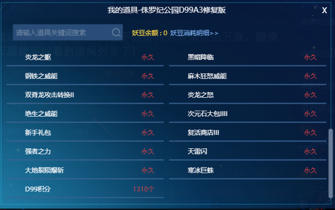 装备描述:11对战平台侏罗纪公园d99A3修复版有黑暗降临三减伤天雷大地轻松打33和20模式具体 道具看图