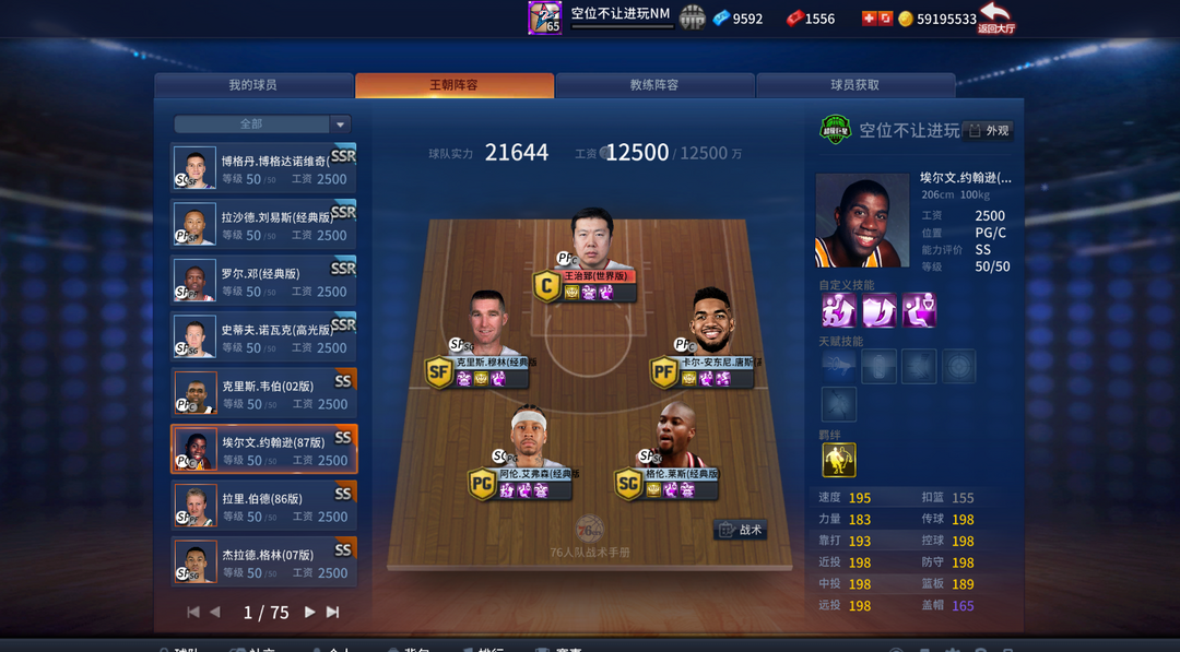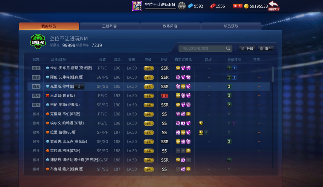 装备描述:SS87+UR王治郅+SSR经典艾佛森+SSR唐斯+SSR莱斯+SSR穆林+全10自建SF+技能全
