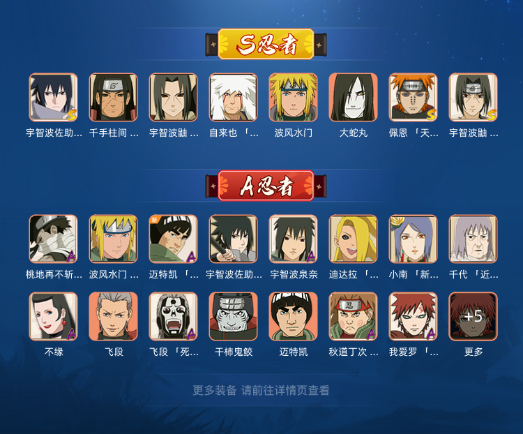 装备描述:永恒佐助 川剧自来也 大蛇丸 水门 秽土柱间 秽土鼬 须佐鼬 佩恩