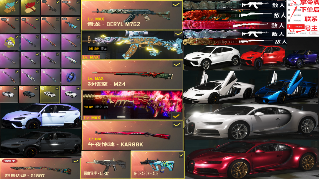 布加迪兰博基尼跑车✅⑩异色金龙青龙M762⑩异色M24孙悟空⑧午夜98K烈日尼尔战神柏林东南亚可排位