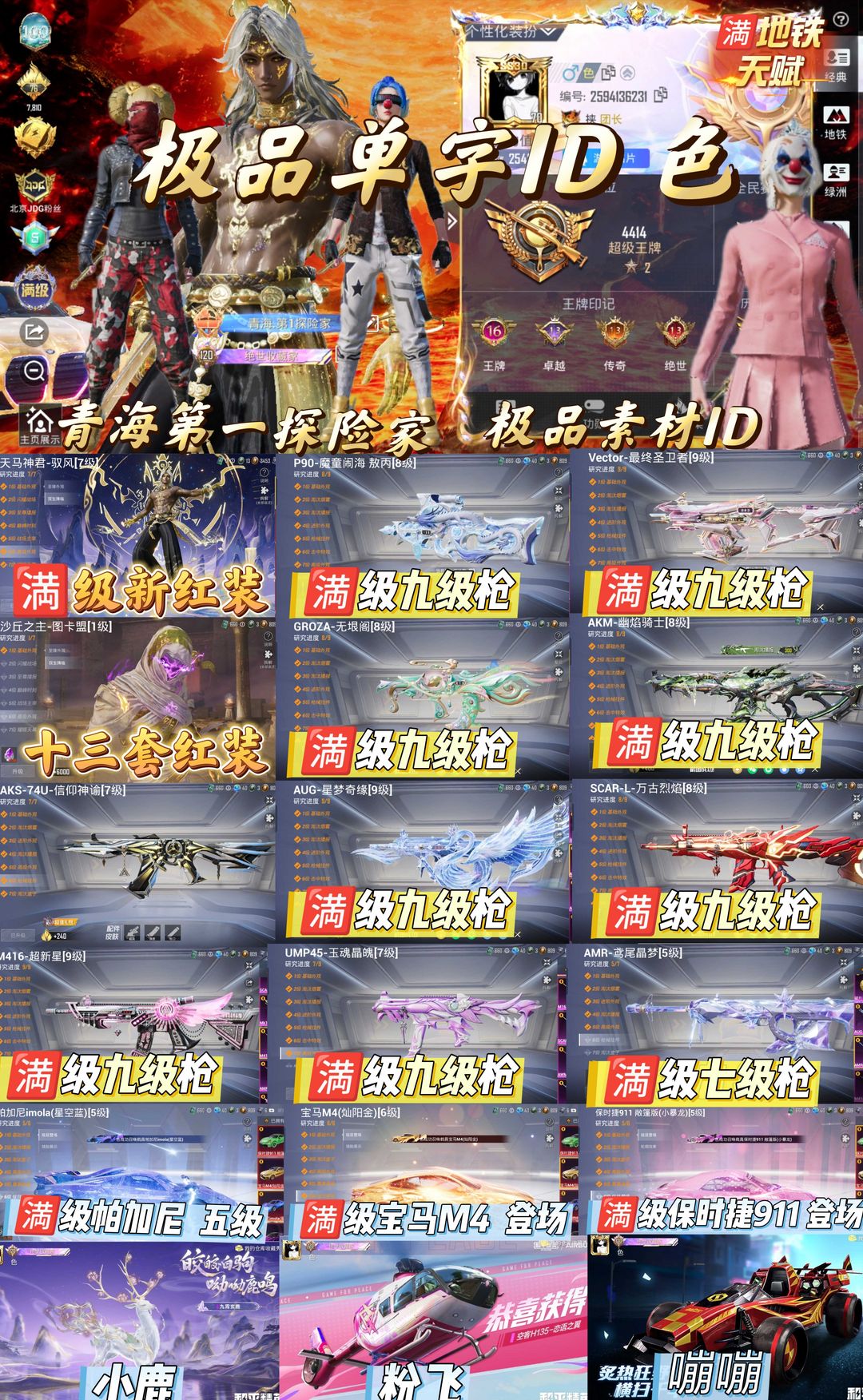 限制: 租号11次及以上 | 撤单率<70%才可租用此帐号装备描述:>>>>>>毁号,涉及毁坏虚拟财产罪及计算机安全罪,请文明游戏素质游戏,让我们共建美好租号平台>>>>>> 本游戏账号:荣耀皇冠Ⅲ段位,特效枪数量5个,粉装数量14套,载具数量5个,优质装备有: AKM-盖世英雄, SCAR-L-天蓬元帅, 套装-怪诞乔克, 套装-数码大师, 套装-缤纷油彩, 套装-放客神游, 套装-齐天大圣, 角色-闪耀迪迦, 放客神游套装, 数码大师套装, 缤纷油彩套装, 齐天大圣套装, 星之信仰飞行翼, 齐天大圣飞行器, 天之羽翼飞行器, 快乐主宰, 小丑背包(1级), 萌熊伴侣背包(1级), 小丑背包(3级), 甜蜜誓约背包(3级)等,供您畅选,感受良好游戏体验! 注意事项: A.游戏过程中请不要恶意挂机或者不文明发言 B.恶意挂机、顶号等行为将被拉黑无法再次下单 C.进入游戏后中途请勿退出登陆,否则无法再次上号 D.部分账号由于异地登录可能会出现密码错误提示,通常再尝试5-6次后可上号 |||||||||喜欢本账号请点 ☆收藏☆ 方便下次租用,谢谢光临惠顾|||||||||