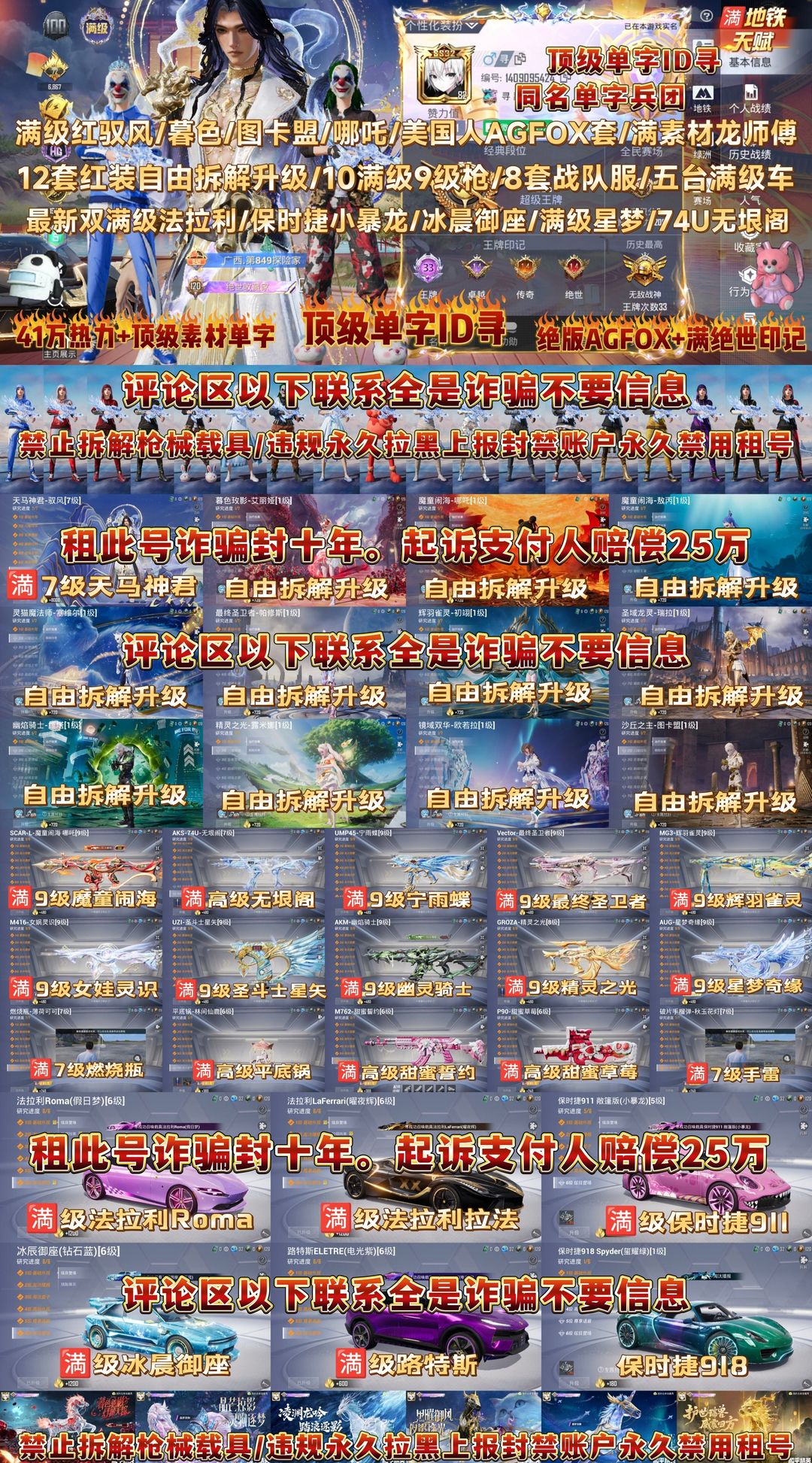 限制: 租号18次及以上 | 撤单率<60%才可租用此帐号装备描述:特别声明!!!! 分解载具枪械永久拉黑不解除 【乱投诉拉黑】和平号有问题/上不去/其他问题/ 特殊需求/投诉没用等问题 账号累计充值超40万!切勿开挂/分解装备/恶意骂人/等等违规行为,发现违规必追查到底(平台登录记录,游戏登录ip手机号 设备串号 充值付款记录不要侥幸现在网警都能调到你的所有行为记录就算盗用他人信息也一样能查到你头上)按账号充值金额=起诉/刑事立案/追责赔偿! 非速玩【非云!本机设备畅玩不卡顿】