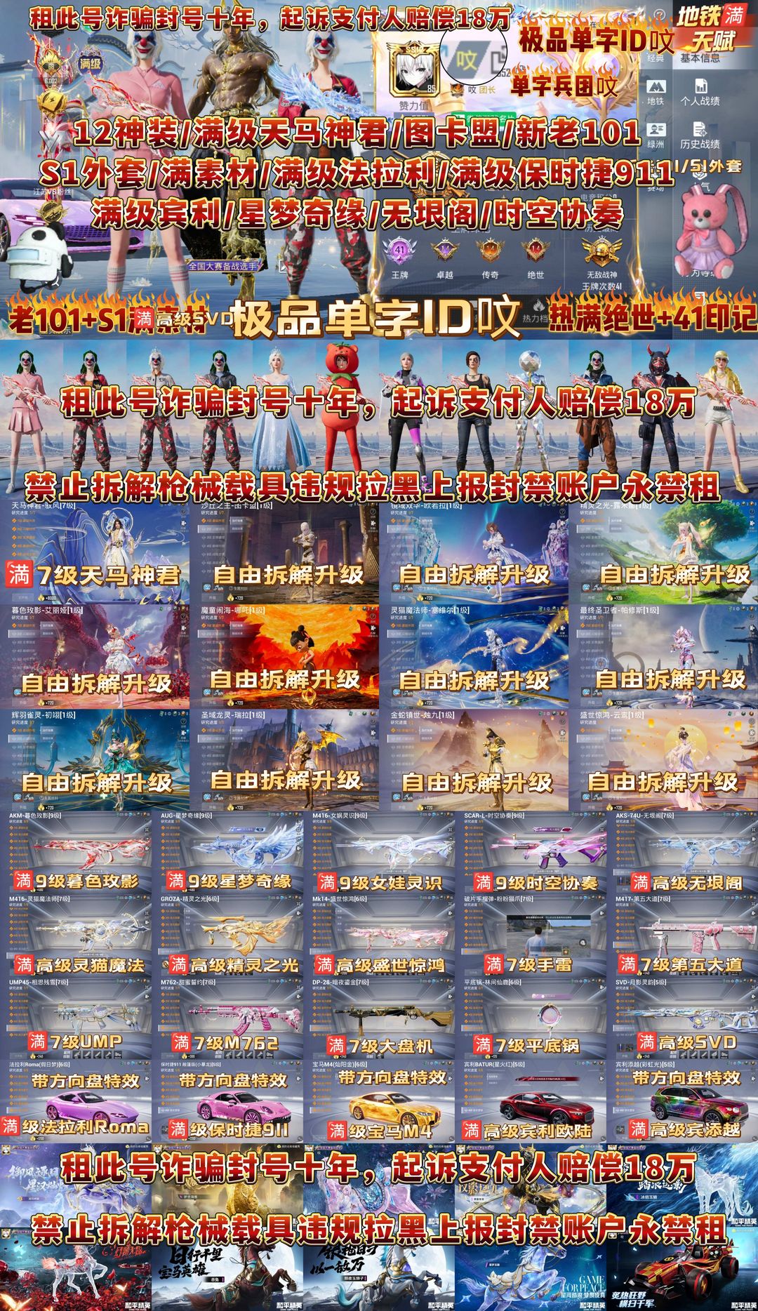 限制: 租号18次及以上 | 撤单率<60%才可租用此帐号装备描述:特别声明!!!! 不要相信评论下面的都是pz 不要相信评论下面的都是pz 不要相信评论下面的都是pz 分解载具枪械永久拉黑不解除 【乱投诉拉黑】和平号有问题/上不去/其他问题/ 特殊需求/投诉没用等问题 账号累计充值超30万!切勿开挂/分解装备/恶意骂人/等等违规行为,发现违规必追查到底(平台登录记录,游戏登录ip手机号 设备串号 充值付款记录不要侥幸现在网警都能调到你的所有行为记录就算盗用他人信息也一样能查到你头上)按账号充值金额=起诉/刑事立案/追责赔偿! 非速玩【非云!本机设备畅玩不卡顿】