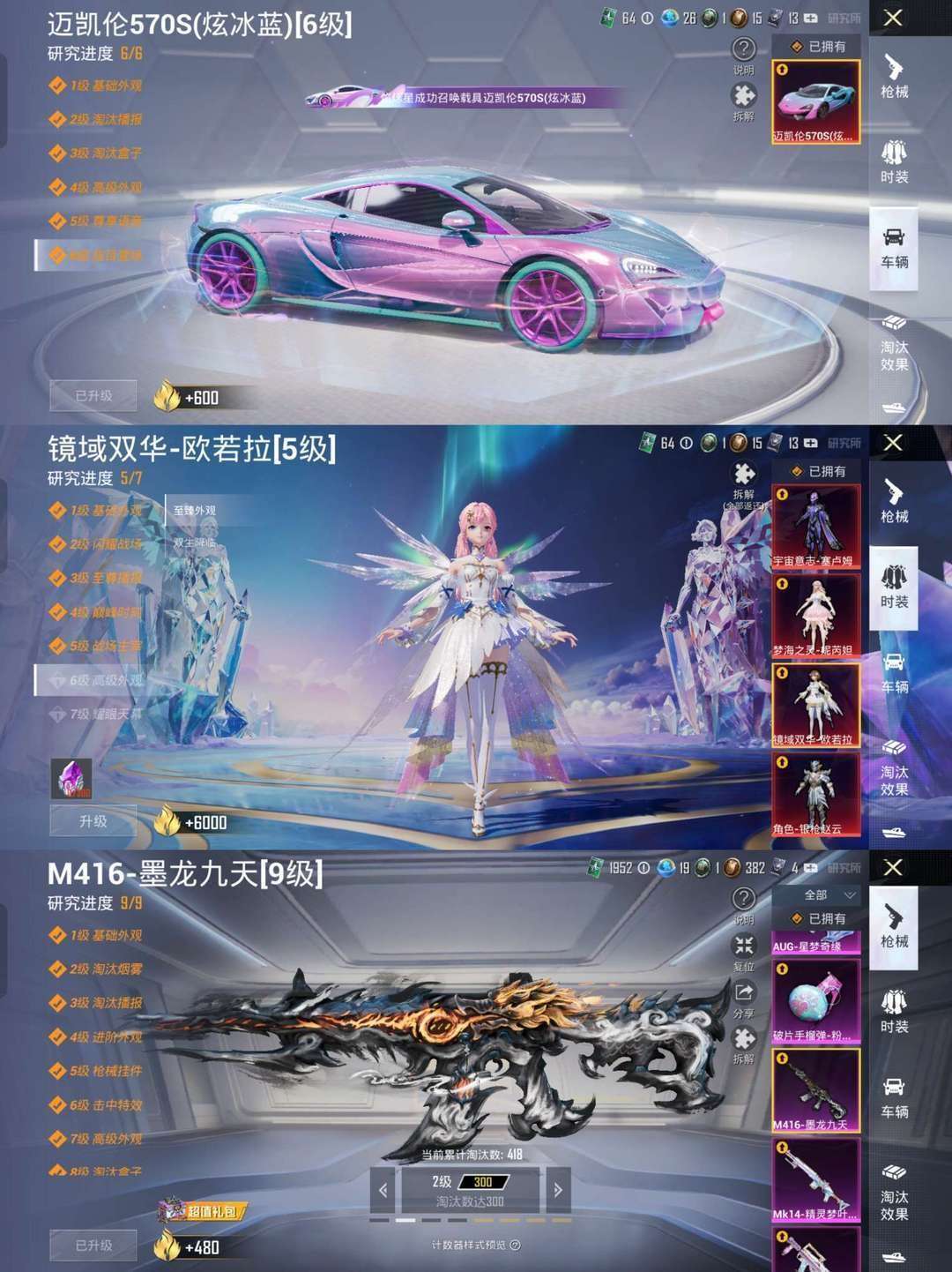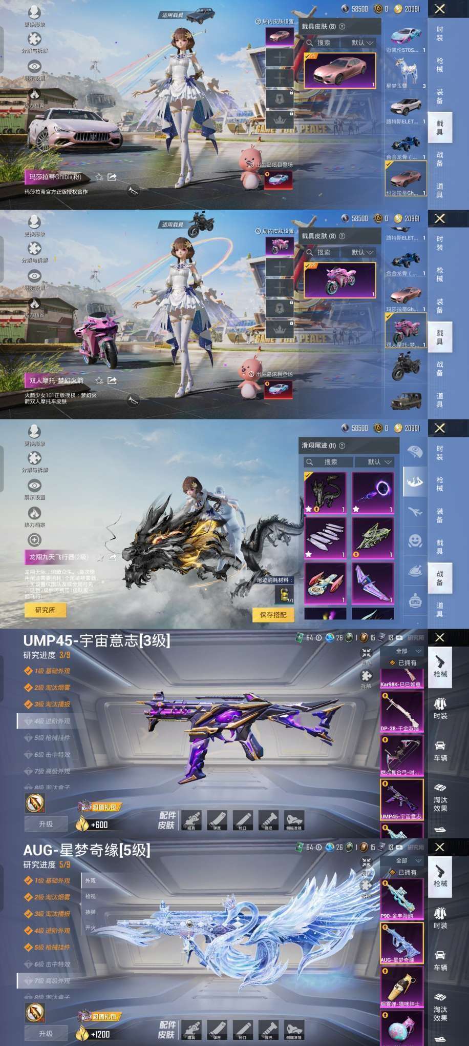 5级红装-欧若拉-5套红装-满6级迈凯轮-9级M4墨龙九天-AUG星梦奇缘-螳螂-粉装载具多
