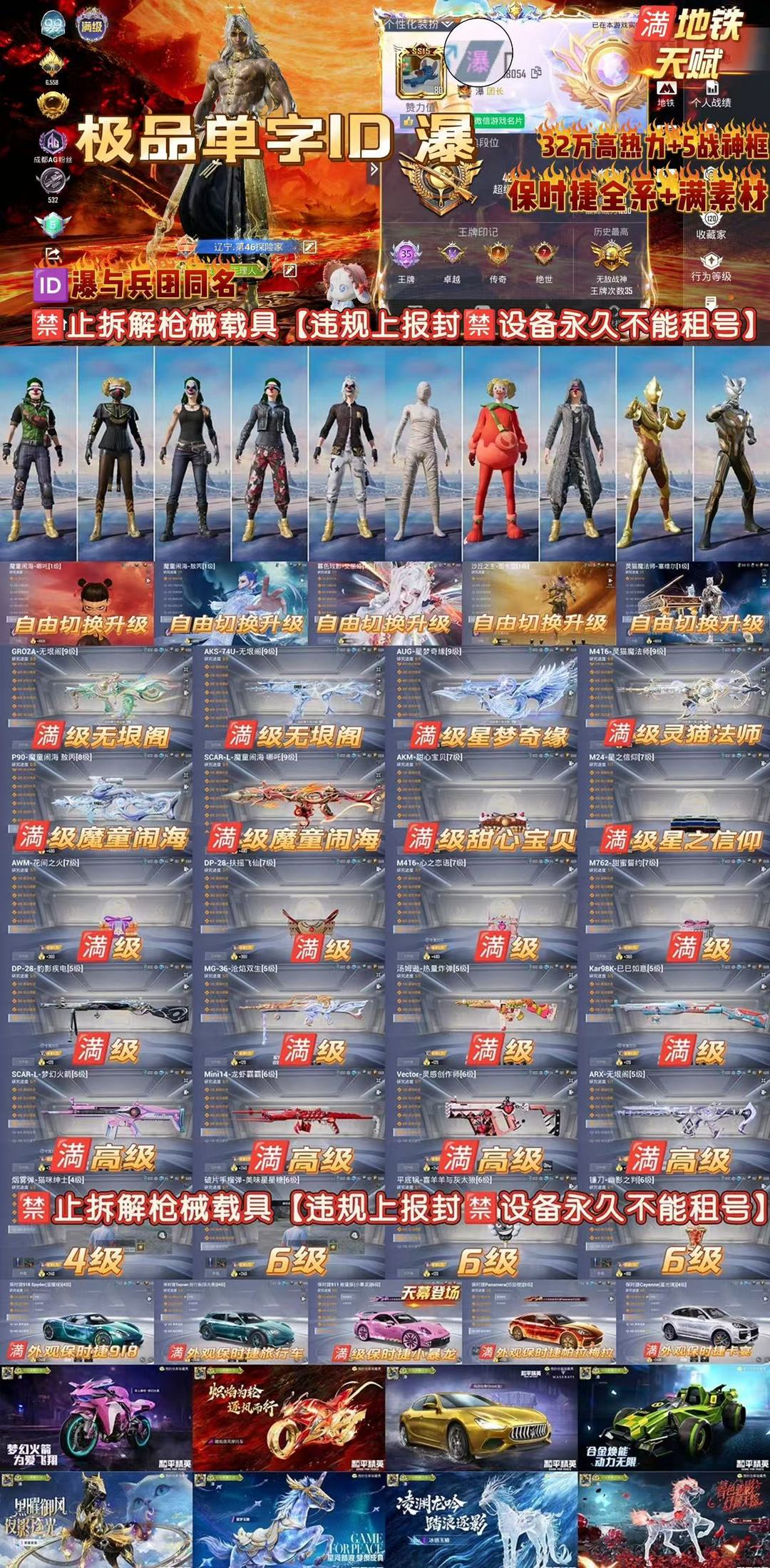 限制: 租号17次及以上 | 撤单率<60%才可租用此帐号装备描述:特别声明!!!! 分解载具枪械永久拉黑不解除 【乱投诉拉黑】和平号有问题/上不去/其他问题/ 特殊需求/投诉没用等问题 账号累计充值超40万!切勿开挂/分解装备/恶意骂人/等等违规行为,发现违规必追查到底(平台登录记录,游戏登录ip手机号 设备串号 充值付款记录不要侥幸现在网警都能调到你的所有行为记录就算盗用他人信息也一样能查到你头上)按账号充值金额=起诉/刑事立案/追责赔偿! 非速玩【非云!本机设备畅玩不卡顿】