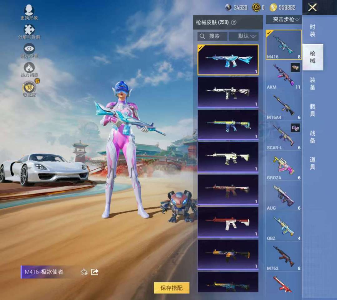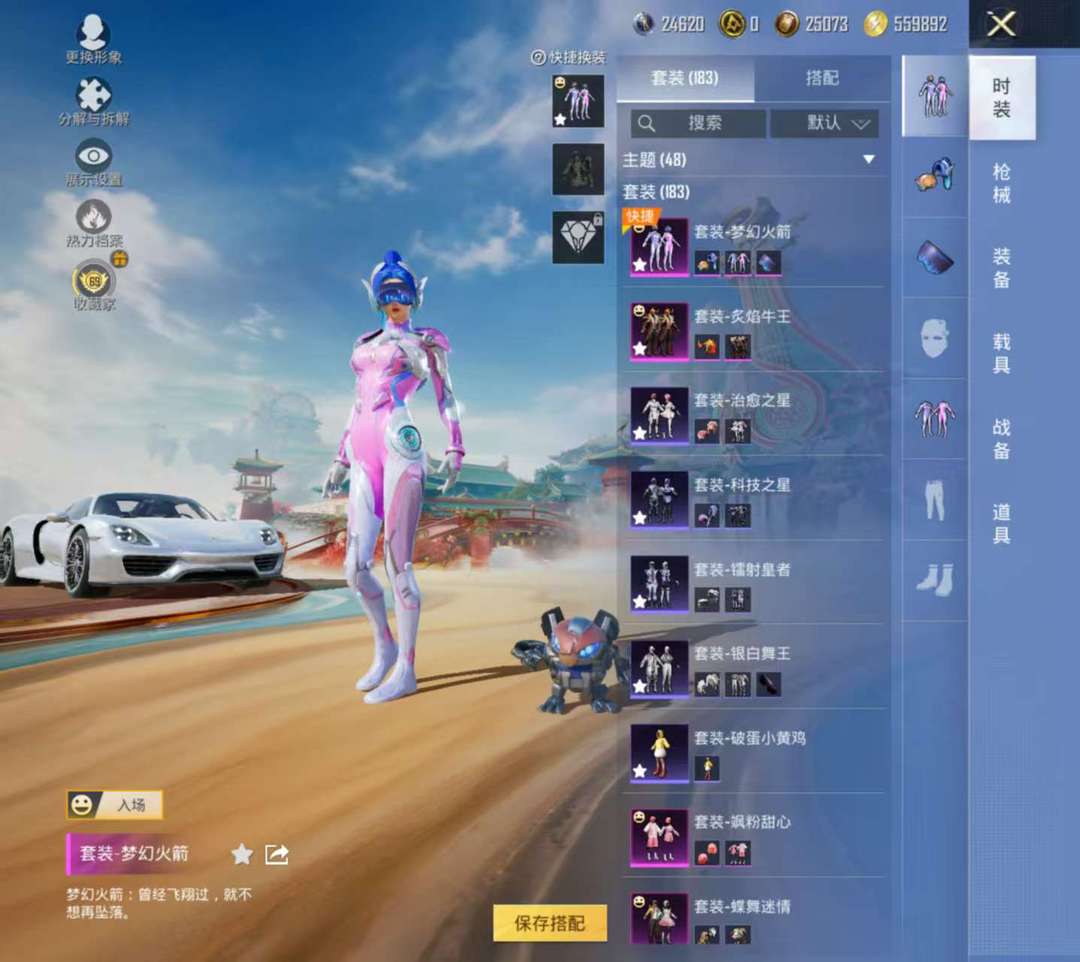 四套粉装,两个升级枪。四辆载具。10个粉色降落伞,火箭少女其他皮肤等等。