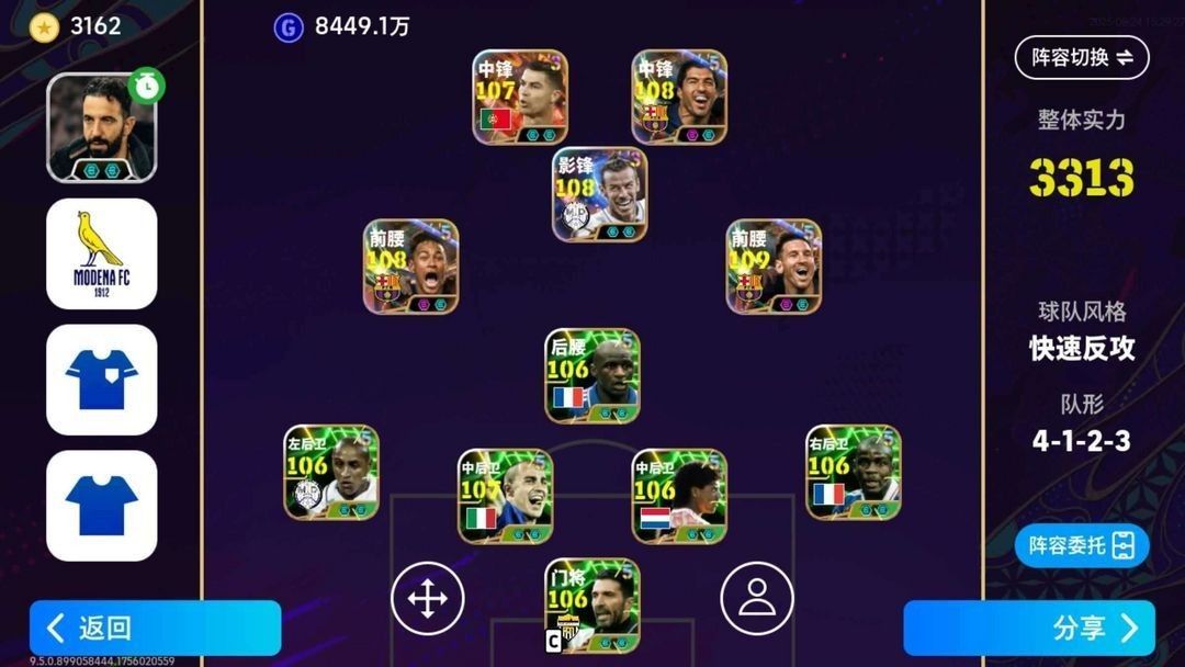 110皮肤5闪新梅西,安卓c罗,msn,新古利特,顶级五闪毕业号,战力最高3313,新卡出就会秒。